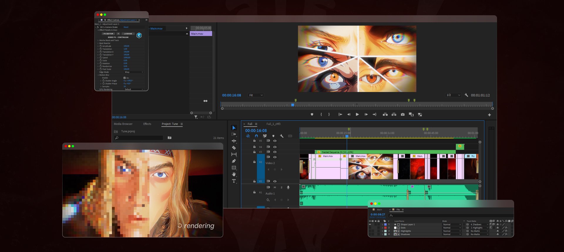 Для постпродакшена использовали АЕ и множество нестандартных плагинов/сборок плагинов: BorisFX Continuum, BorisFX Saphire, Deep Glow, Trapcode Particular, Video Copilot Color Vibrance, Video Copilot Saber, Video Copilot Optical Flares, Duik. Финальный монтаж проходил в Premiere Pro. Использовали Time Ramp для расстановки акцентов ролика под уже готовую музыку. Итоговый ролик отшлифовали TopazAI для увеличения резкости и количества кадров.