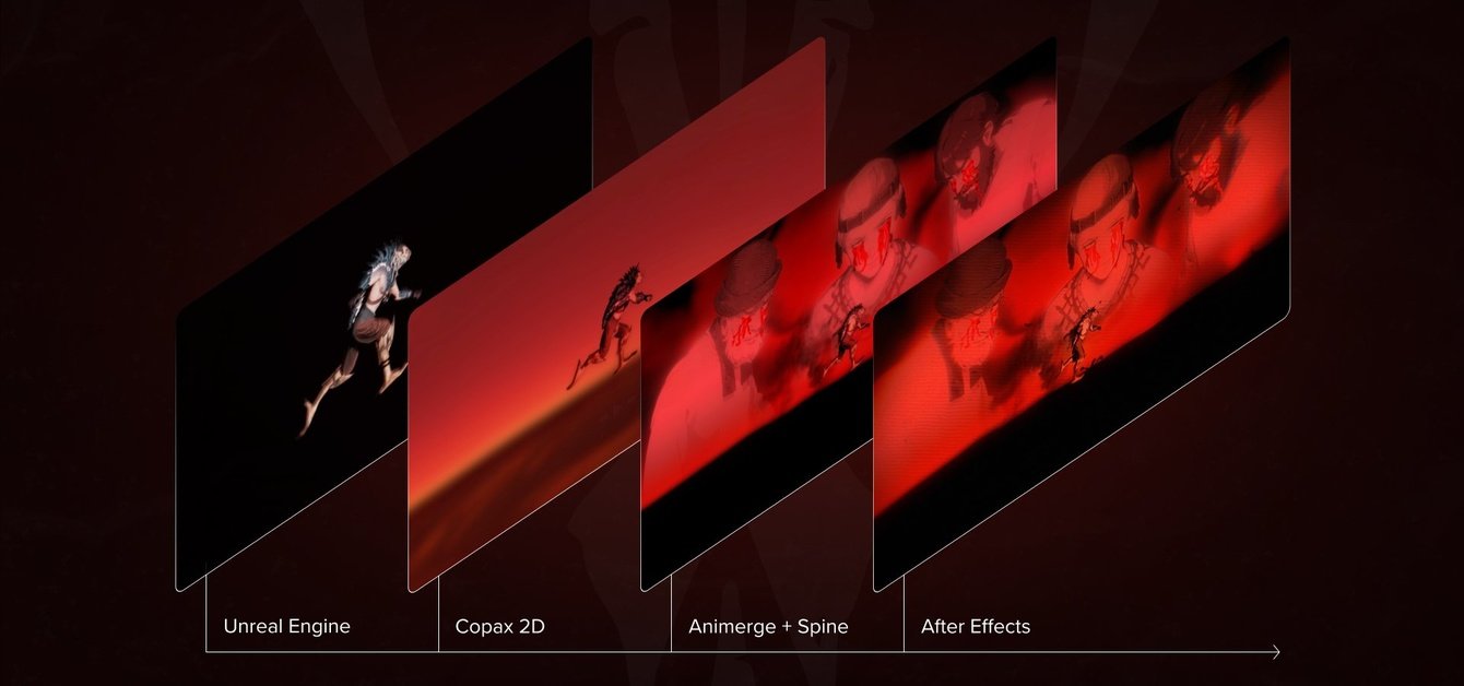 Модели персонажей брались из UE-репозитория заказчика. Снималась анимация основных моментов в самом Unreal Engine, затем несколько кадров «стилизовали» при помощи рабочего пространства “Img2Img” в ComfyUI и с использованием двух аниме моделей, натренированных под стилистику Copax 2D и Flat-2D Animerge.