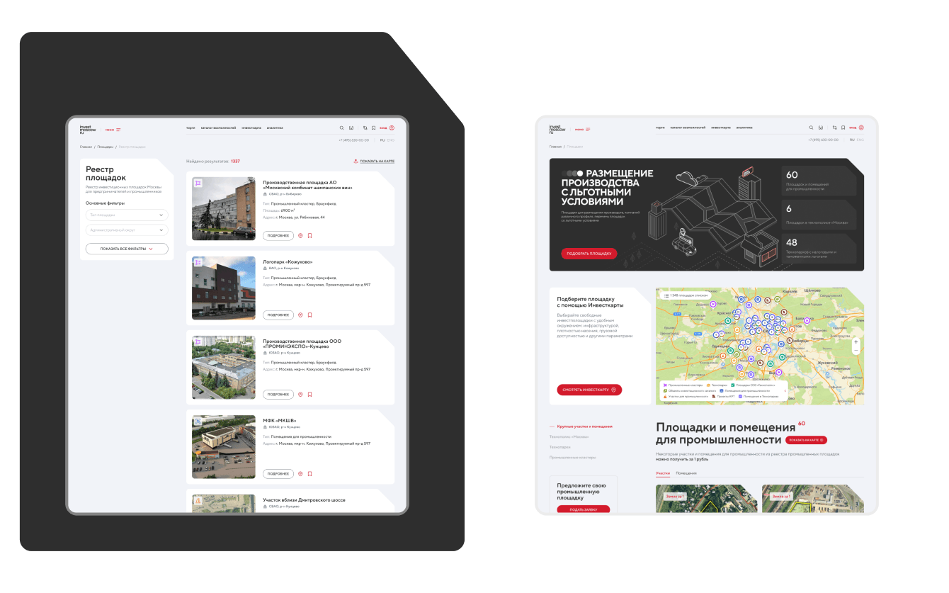 2) Промышленники: могут быстрее подбирать площадки для проектов благодаря фильтрам, сравнению объектов и интеграции данных о городской инфраструктуре.