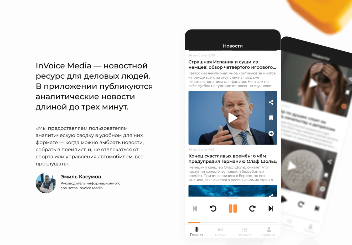 У заказчика был сайт и необходимо было в сжатые сроки разработать мобильное приложение аудио-новостей под платформы iOS и Android.