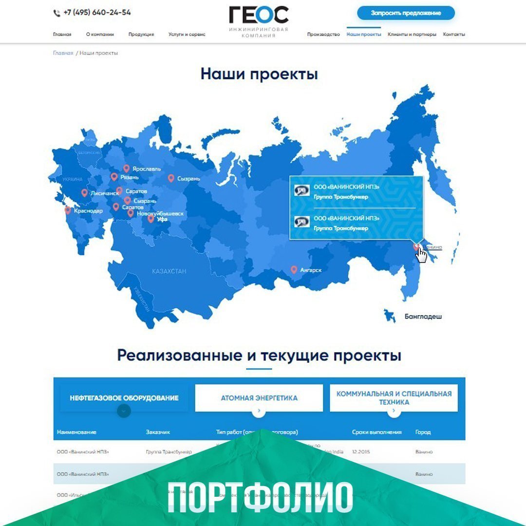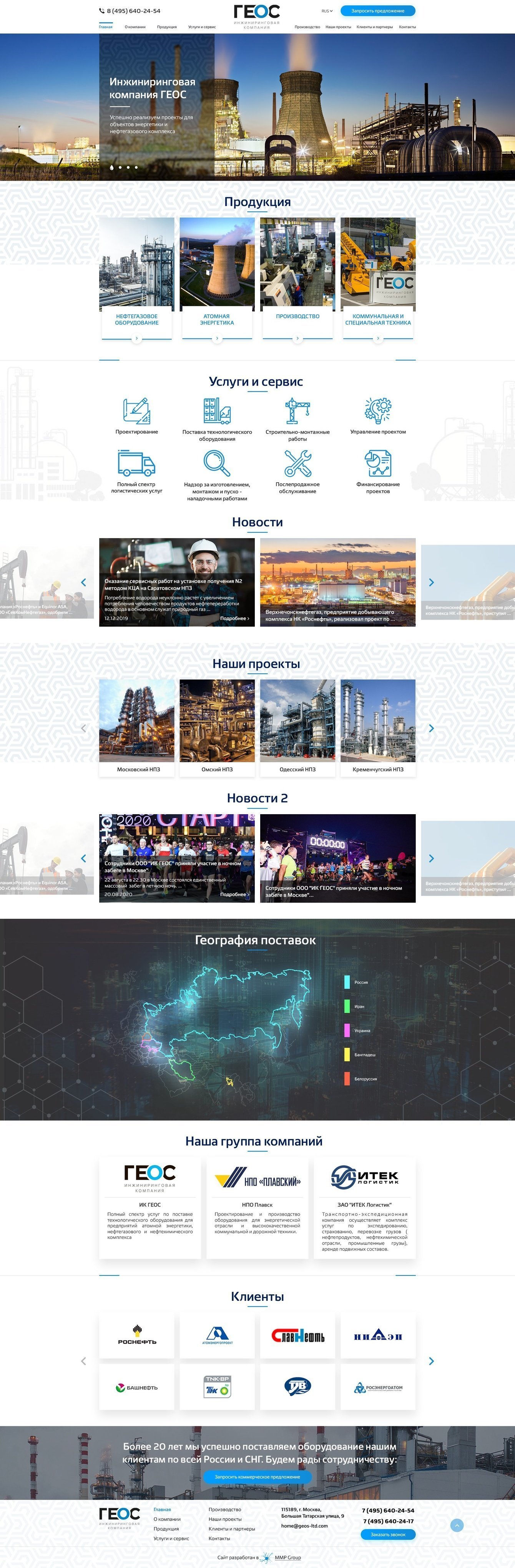 Компания «ГЕОС» работает в нефтегазовом секторе, а также в сфере атомной энергетики. Сотрудничает с крупнейшими компаниями, такими как Роснефть, Лукойл, Росатом. За это время у компании появилась своя производственная площадка по изготовлению оборудования для энергетики в Плавске. Помимо этого, у компании есть ещё направление по производству коммунальной спецтехники, для представления которой мы также делали отдельный сайт.