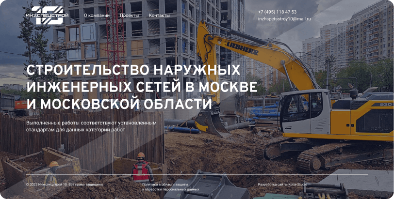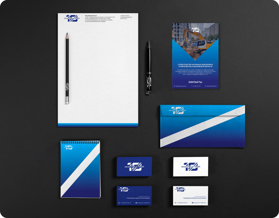 ИнжСпецСтрой10 — стремительно развивающаяся компания по строительству наружных инженерных сетей в Москве, которая работает по немецким стандартам качества. Заказчик обратился к нам за созданием фирменного стиля, айдентики и сайта визитки для узнаваемости бренда.