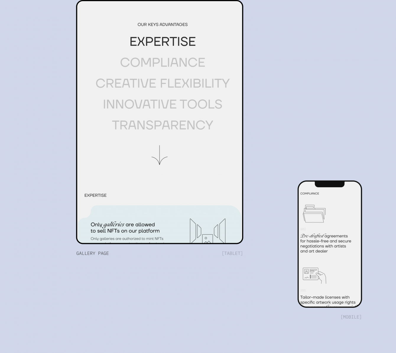 Вместе мы проработали брендинг, ux, ui, legal design, который позволил прозрачно доносить информацию о размере получаемых прав при приобретении обьектов. А с помощью своих смарт-контрактов обеспечивает распределение прибыли всем участникам: галереям, художникам, дилерам, кураторам и коллекционерам.