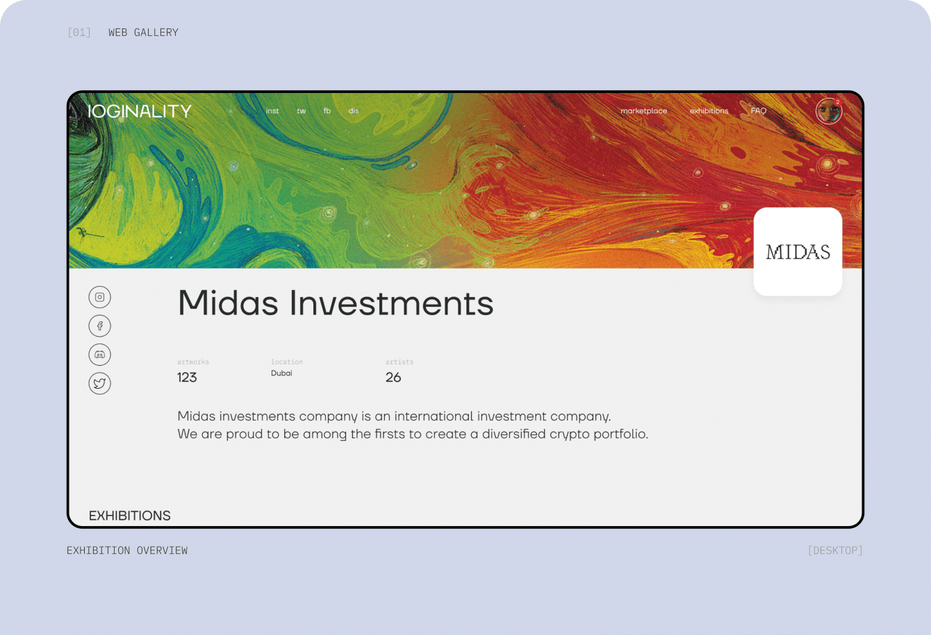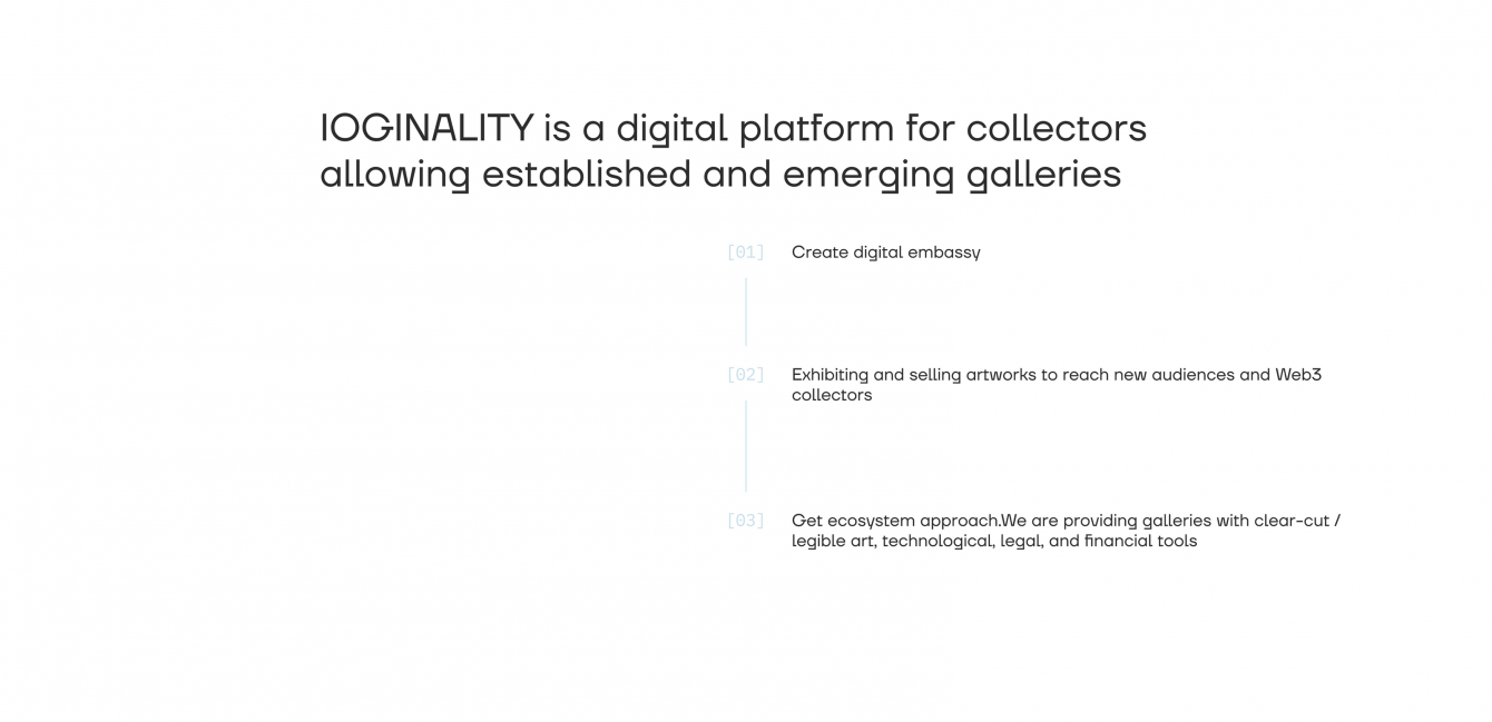 IOGINALITY — это платформа для художественных галерей, коллекционеров и арт-дилеров по всему миру, которое позволяет запускать виртуальные выставки, создавать и продавать коллекции в виде NFT. Оно создано для галерей современного искусства и предоставляет доступ к художникам со всего мира.