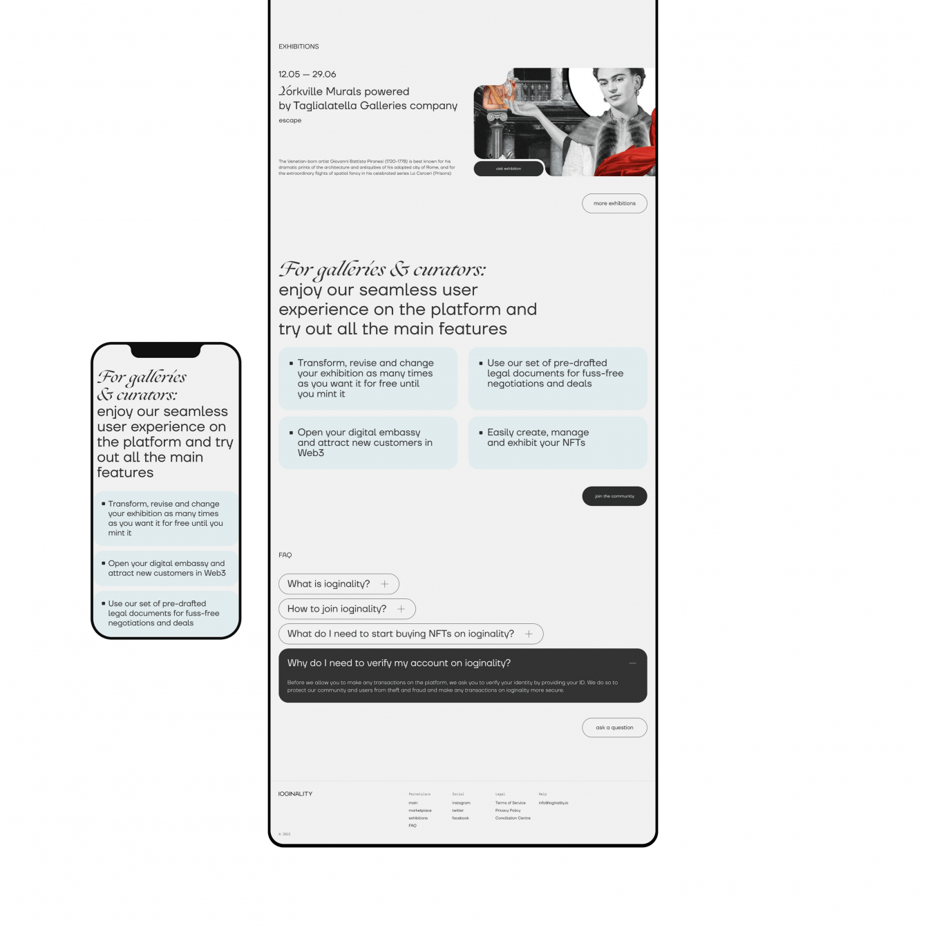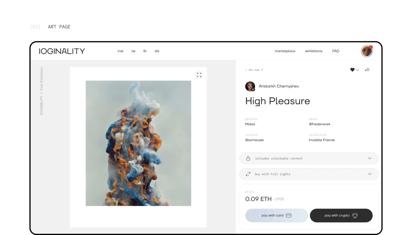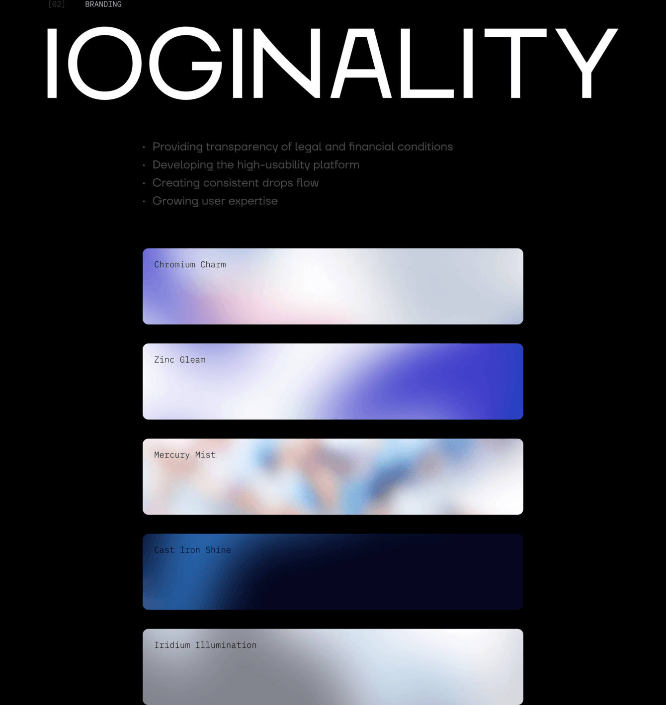 IOGINALITY — это платформа для художественных галерей, коллекционеров и арт-дилеров по всему миру, которое позволяет запускать виртуальные выставки, создавать и продавать коллекции в виде NFT. Оно создано для галерей современного искусства и предоставляет доступ к художникам со всего мира.