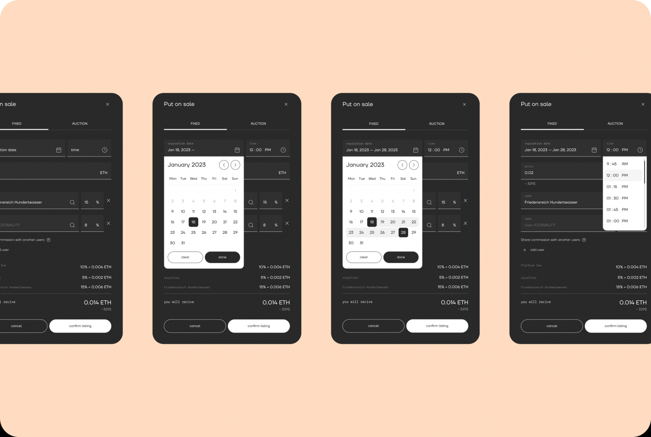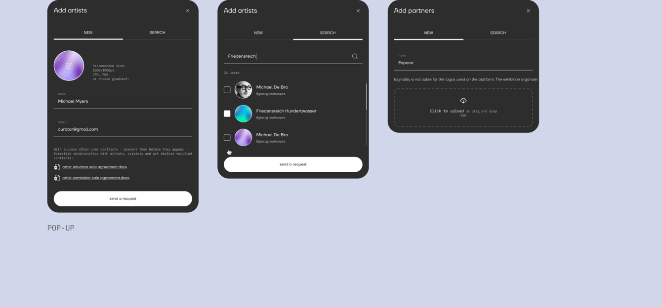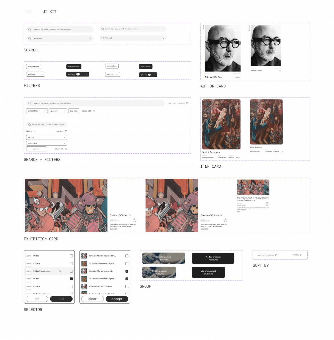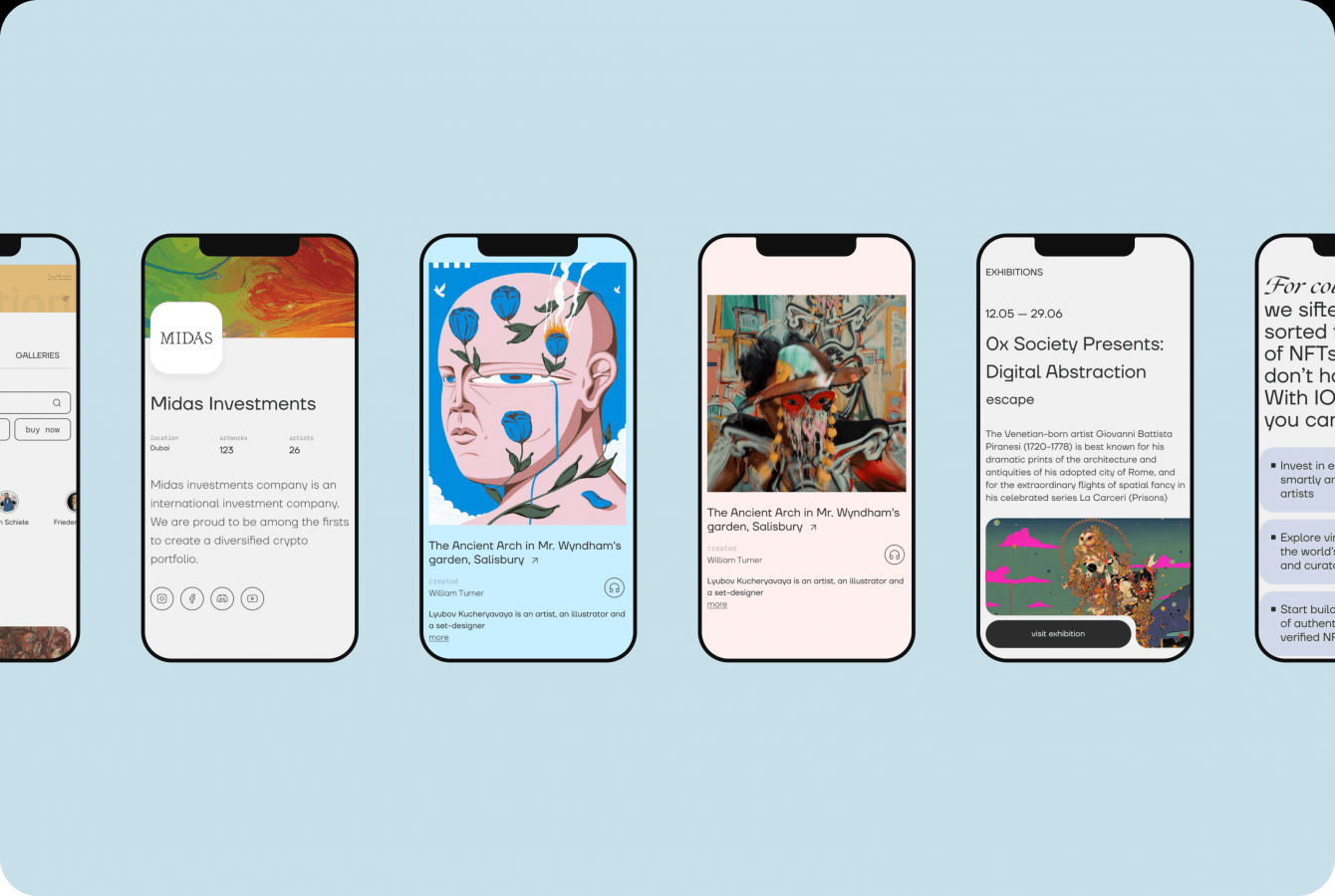 Вместе мы проработали брендинг, ux, ui, legal design, который позволил прозрачно доносить информацию о размере получаемых прав при приобретении обьектов. А с помощью своих смарт-контрактов обеспечивает распределение прибыли всем участникам: галереям, художникам, дилерам, кураторам и коллекционерам.