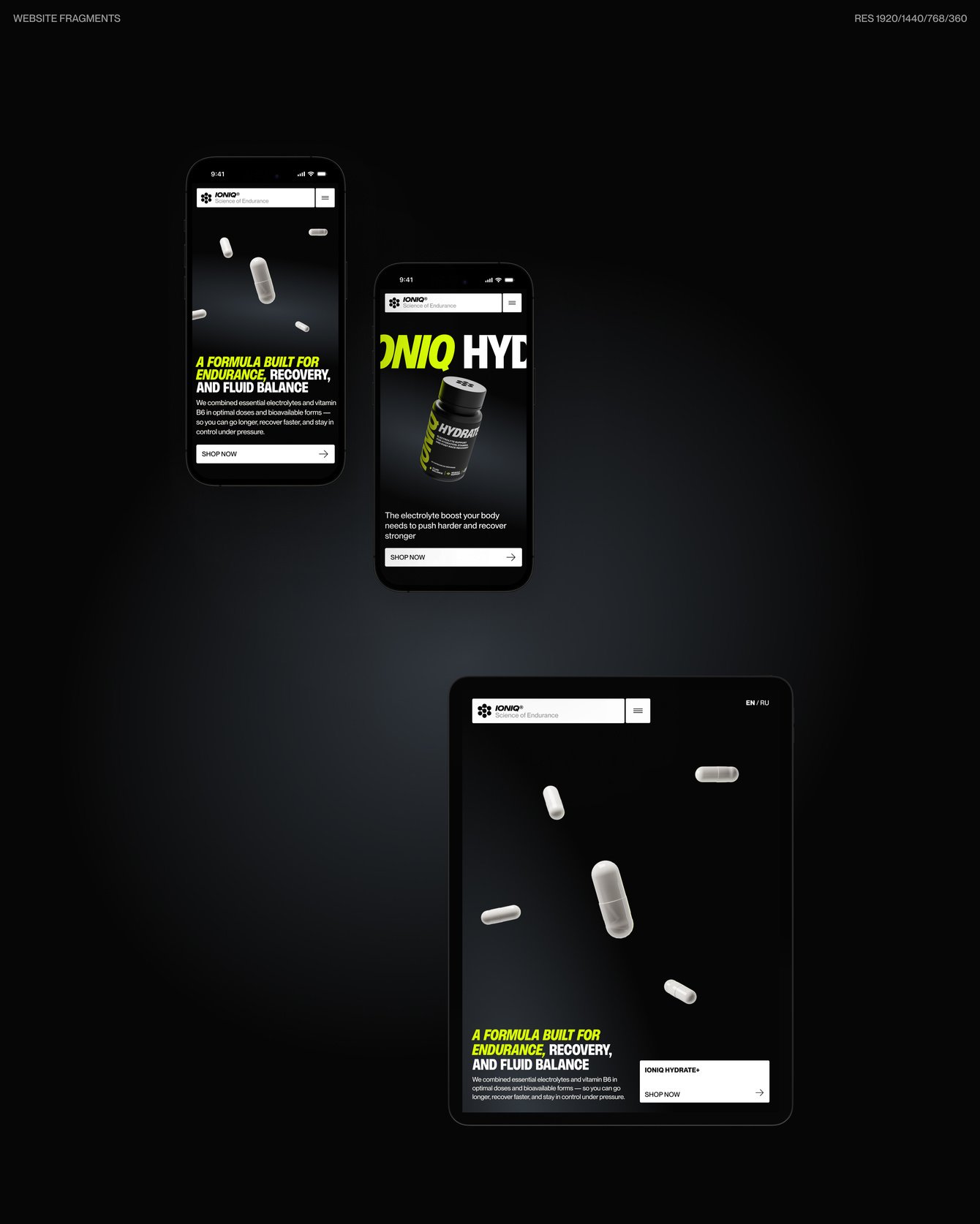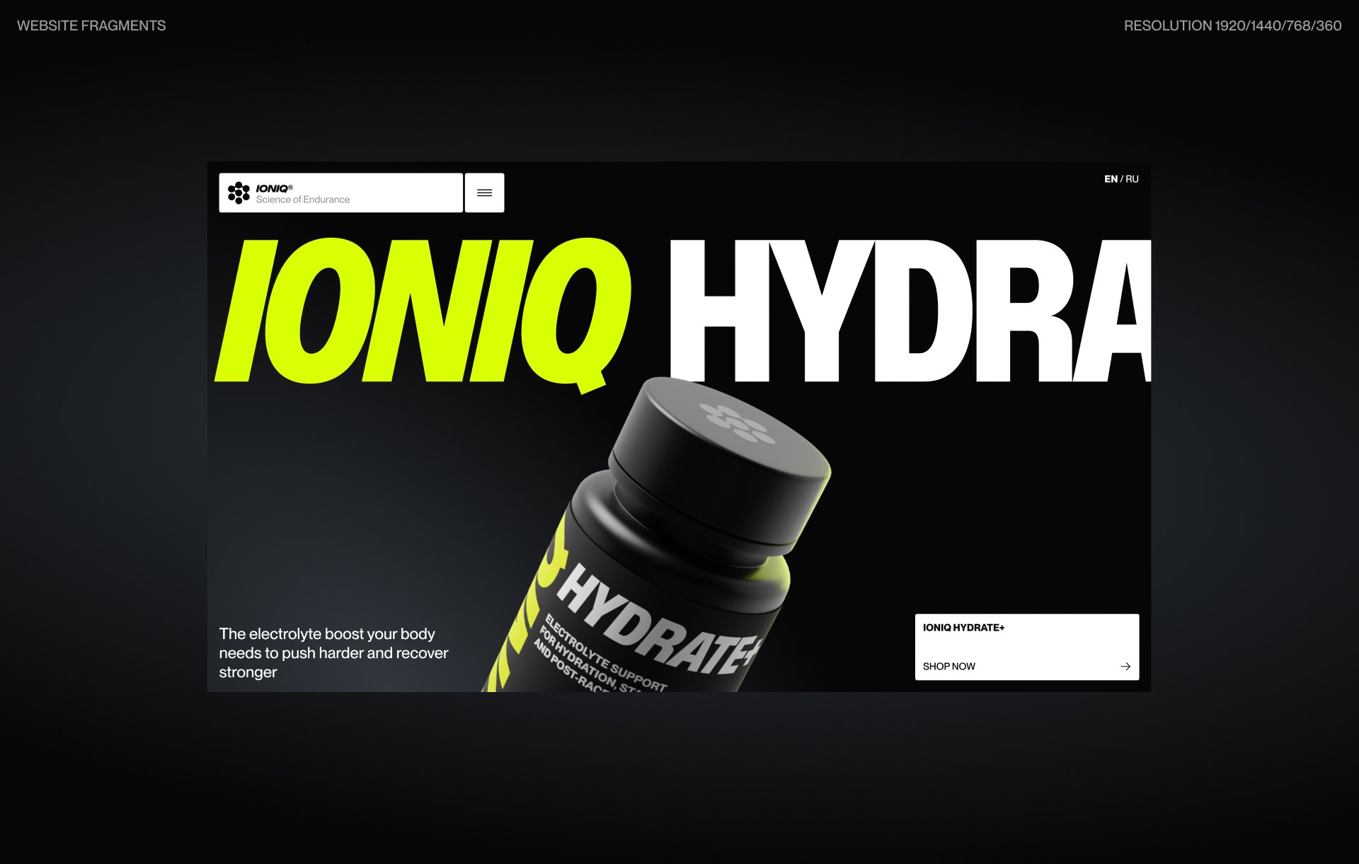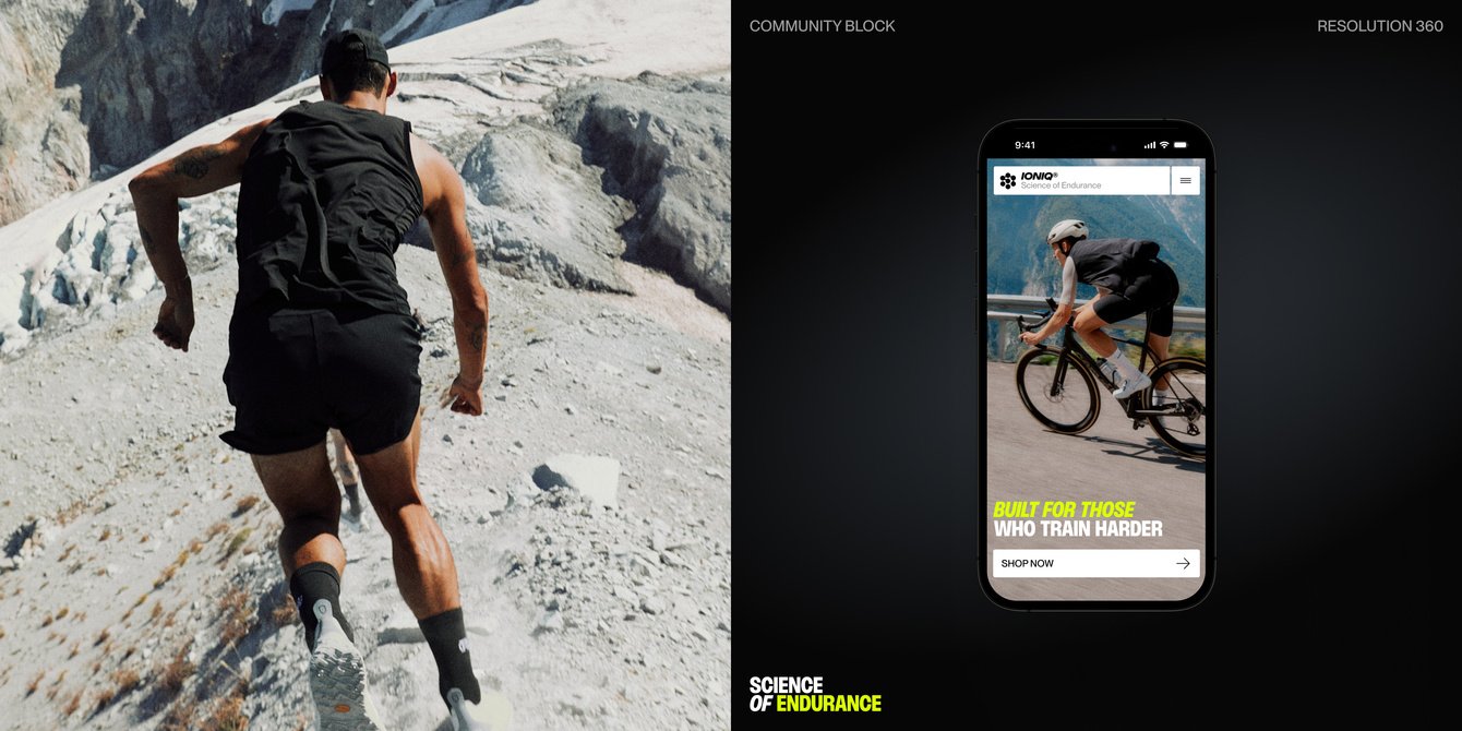 В дизайне мы стремились подчеркнуть динамику цикличных видов спорта и технологичность самого комплекса Ioniq — мы использовали сочетание глубокого черного и акцентного желто-зеленого оттенка, который позволил нам сделать акцент на важной информации и визуально приятно презентовать сам продукт.