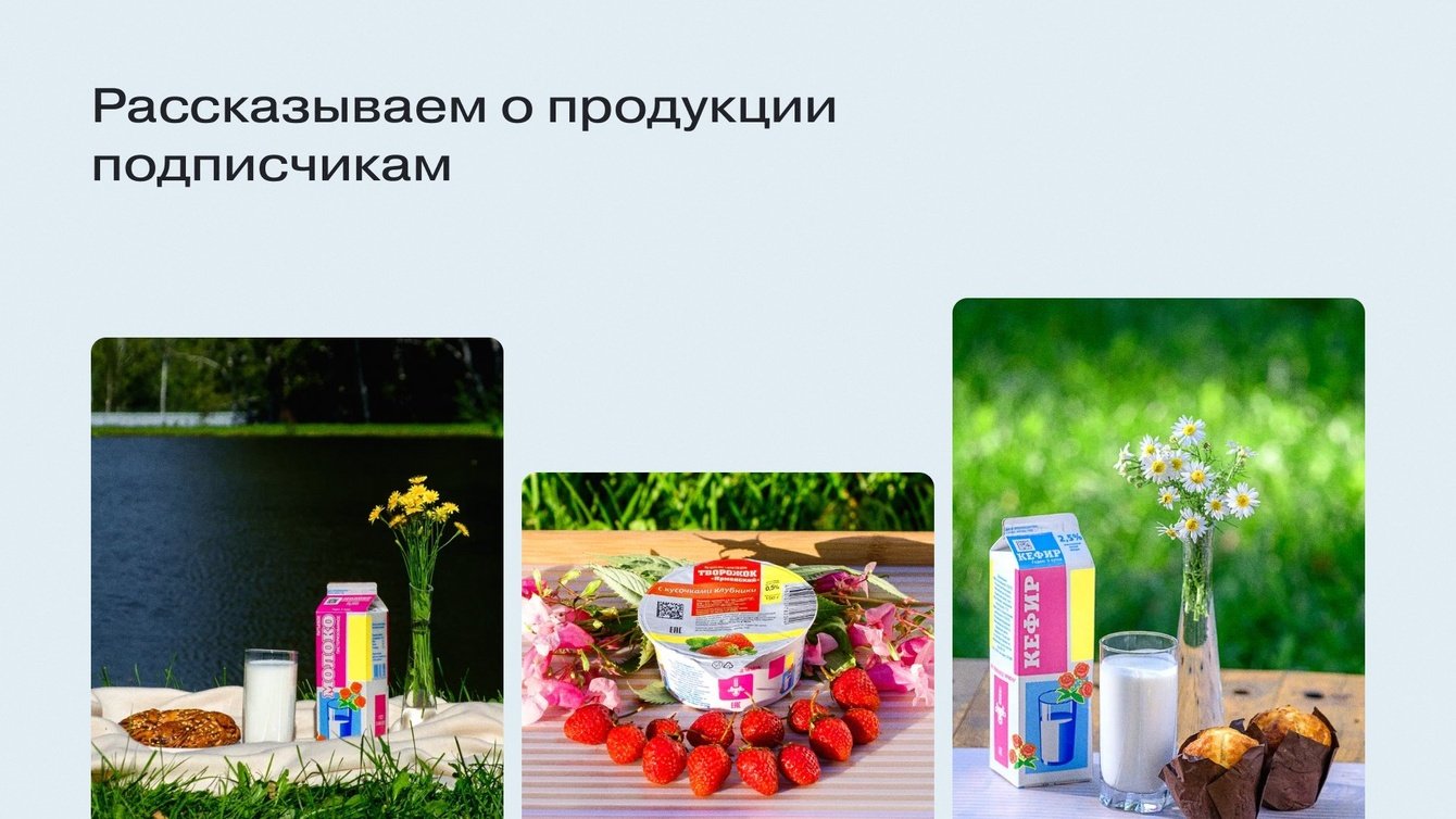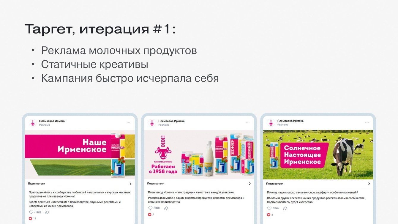 Крутили в рекламе статические креативы, делали упор на основной товар — молочную продукцию. Поначалу аудитории конкурентов и старого сообщества дали нам хороший прирост, однако эти рекламные кампании быстро исчерпали себя.