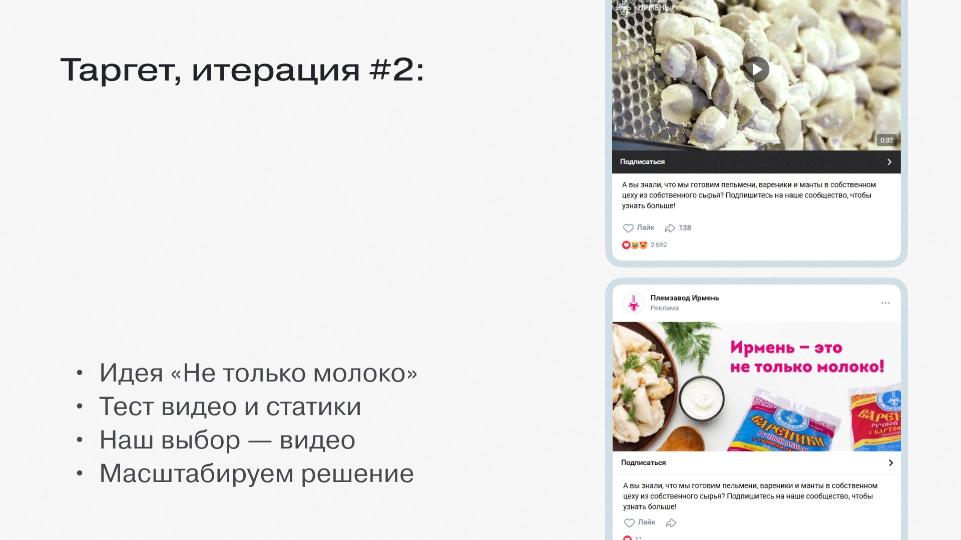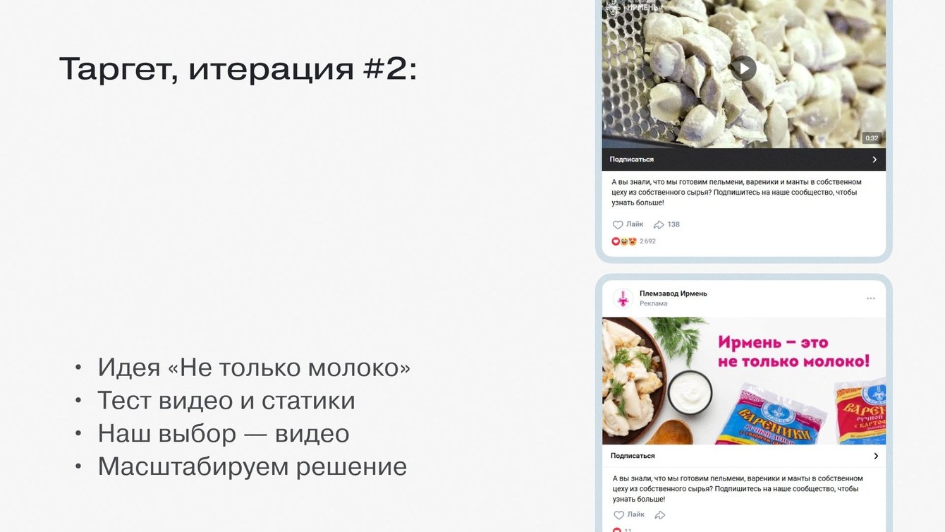 Так мы сформулировали идею «Ирмень — это не только молоко». Сделали два креатива: статичный баннер и видео из пельменного цеха. Видео показало себя отлично, рекламная кампания быстро начала набирать обороты.