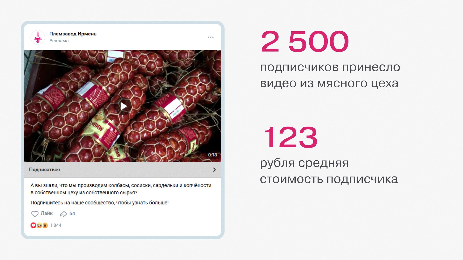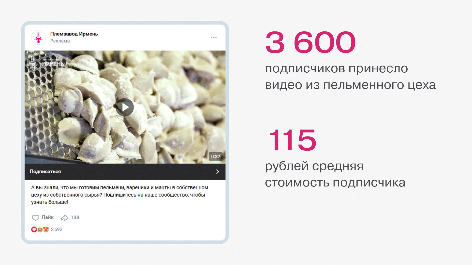 В итоге видео из пельменного цеха стало основным креативом для таргета в этом проекте. Общее число подписчиков, которых оно привлекло — 3600 человек. Средняя стоимость подписчика — 115 рублей.