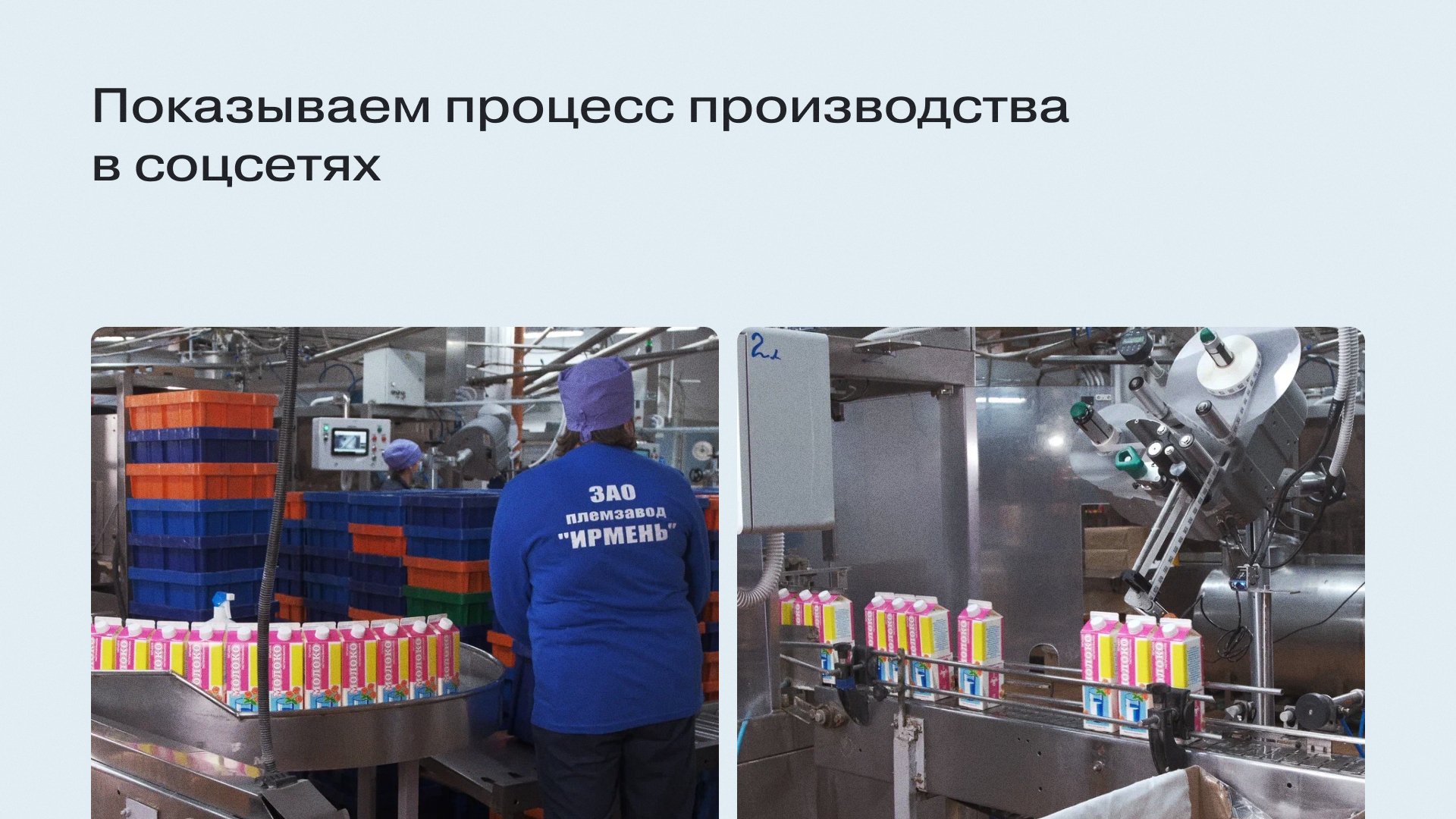 Чтобы разнообразить объявления и контент, сделали второй креатив в формате видео. Снова использовали идею «Не только молоко», но на этот раз — сняли видео в мясном цехе. Рассказываем и показываем, как «Ирмень» делает колбасу.