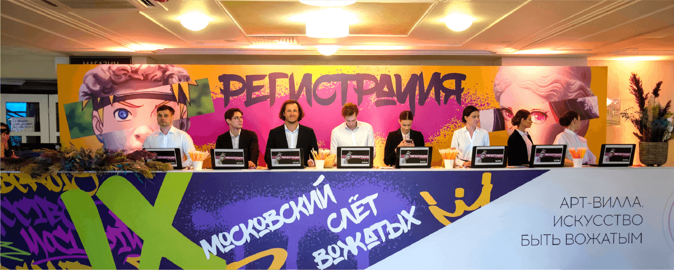 Московский слет вожатых включает в себя ряд важных составляющих, например, сайт с формой для регистрации и программой, фотозоны и арт-объекты на площадке, стенды с расписанием для каждой аудитории, дресс-код, церемонии награждения и заставки для экранов. Фирменный стиль должен был способствовать объединению этих офлайн- и онлайн-элементов в одну концепцию и созданию эффекта целостного продукта.