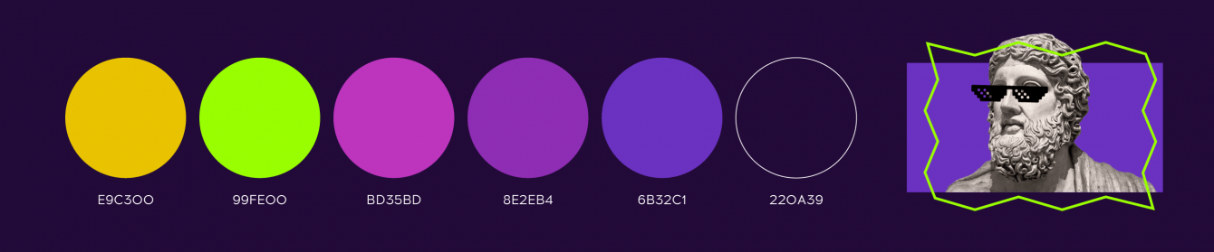 • схожие цвета: фиолетовый (BD35BD и 8E2EB4), желтый (E9C300), зеленый (99FE00), синий (220A39 и 6B32C1), а также белый (фон) и черный (основной текст);