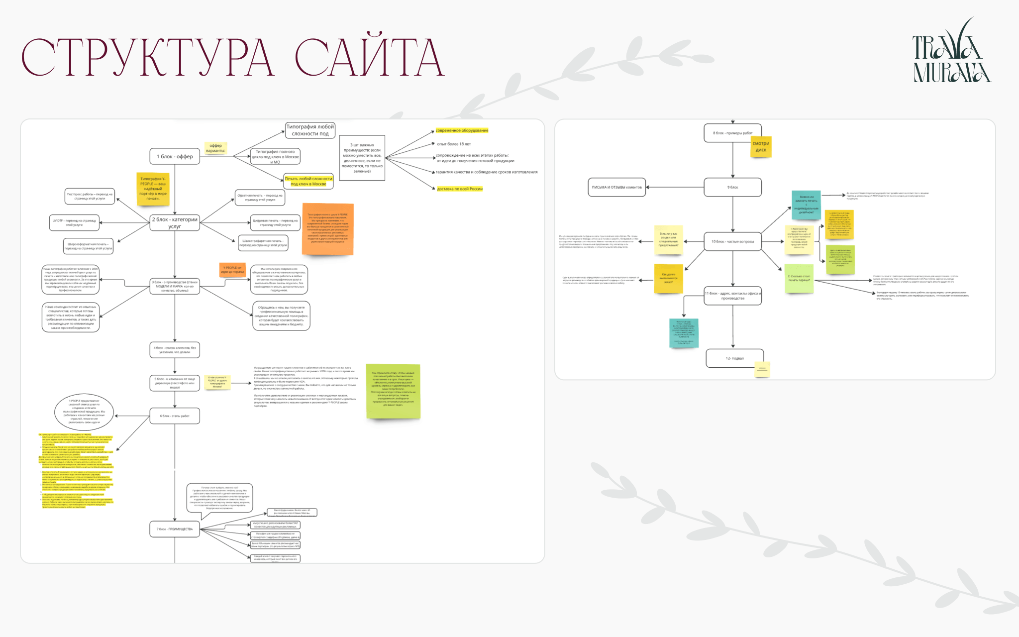 Далее мы расписали структуру сайта (кратко). Для нас было очень важно, чтобы сайт был функциональным и интуитивно понятным для клиентов типографии, а их портрет нам рассказали подробно, поэтому при составлении блок-схемы опирались на этих трех китов: портрет ЦА, анализ конкурентов, функциональность.
