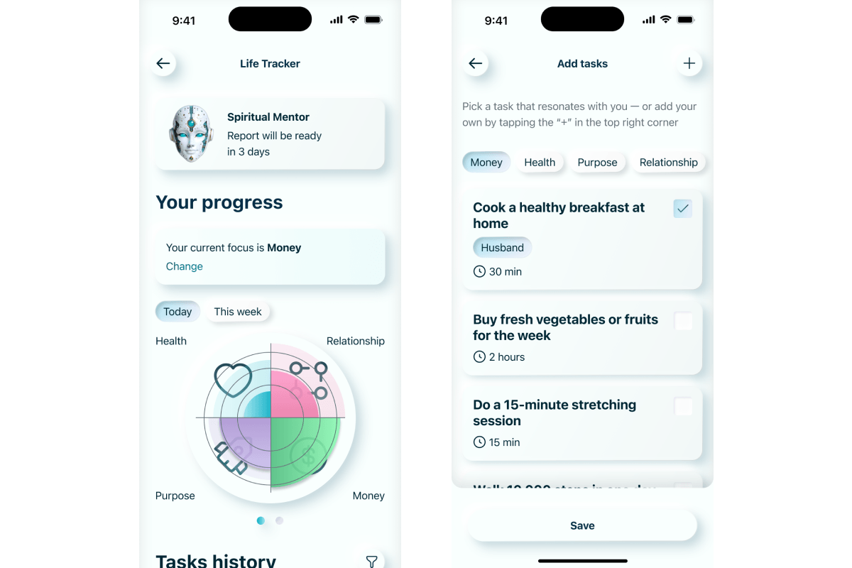 Целью клиента было создать мобильное приложение на основе технологий искусственного интеллекта, которое выступало бы в качестве коуча по саморазвитию, саморефлексии и отслеживанию своего жизненного баланса.
