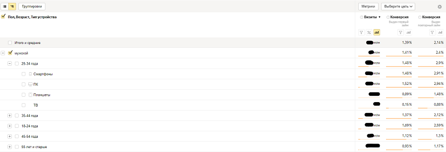 В Метрике появилась информация о первых и повторных займах, притом в разрезе всех доступных группировок. Мы смогли использовать группировки по полу, возрасту и типу устройств, определять эффективные срезы и корректировать рекламные кампании.