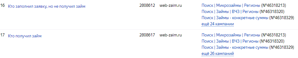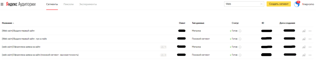 Так, мы создали сегмент Метрики на основе данных о займах для корректировок или в отдельного таргетинга