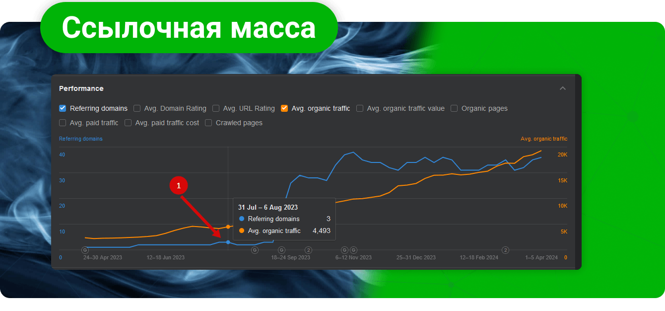 Дополнительно: у сайта был слабый ссылочный профиль, на начало работ около 2-3 домена донора.