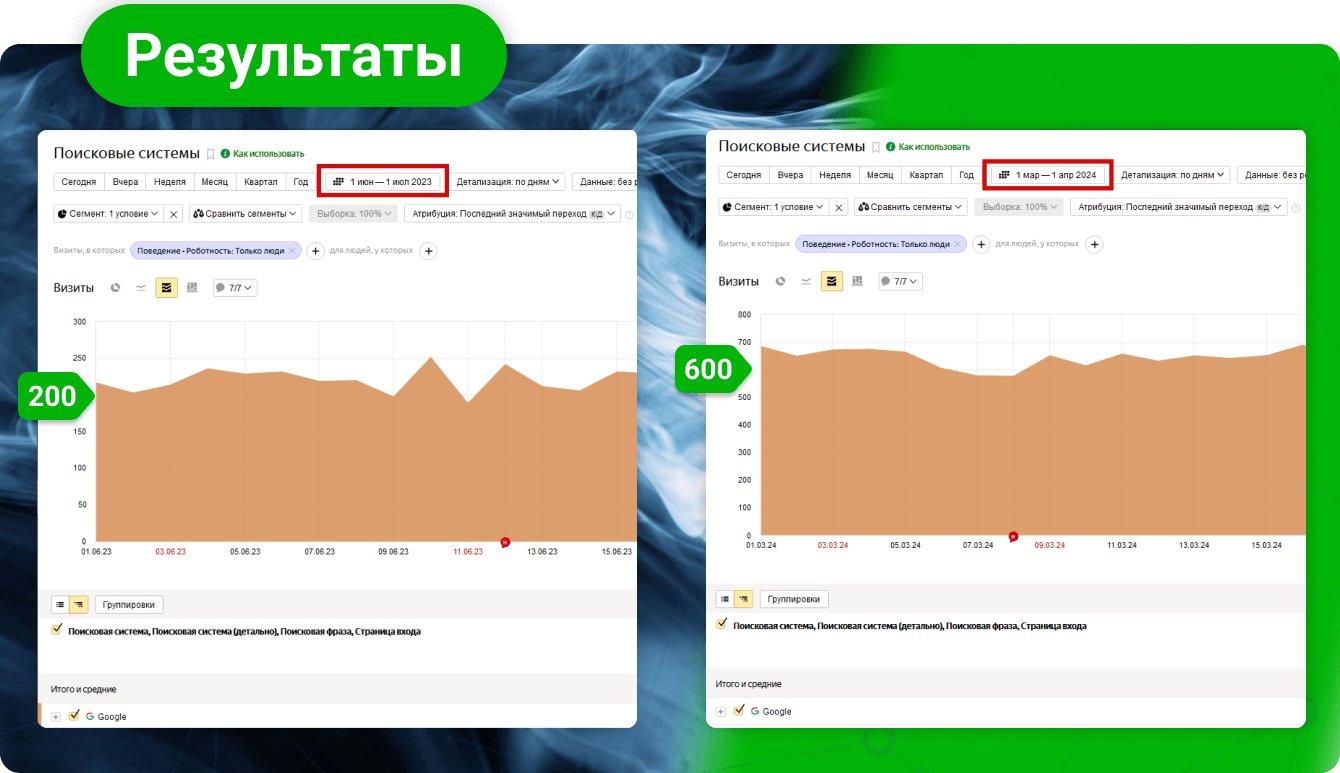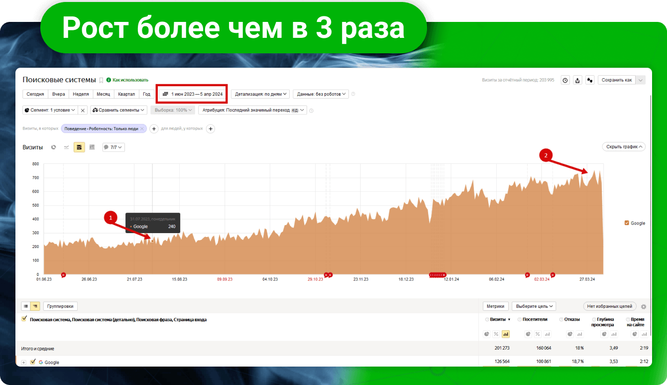 Согласно данным из Яндекс Метрики органический трафик из Google вырос более чем в 3 раза.