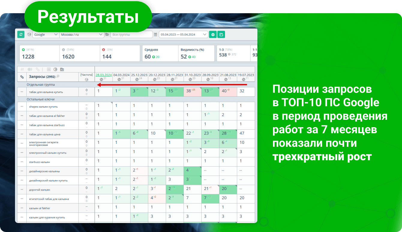 Позиции запросов в ТОП-10 ПС Google в период проведения работ за 7 месяцев показали почти трехкратный рост.