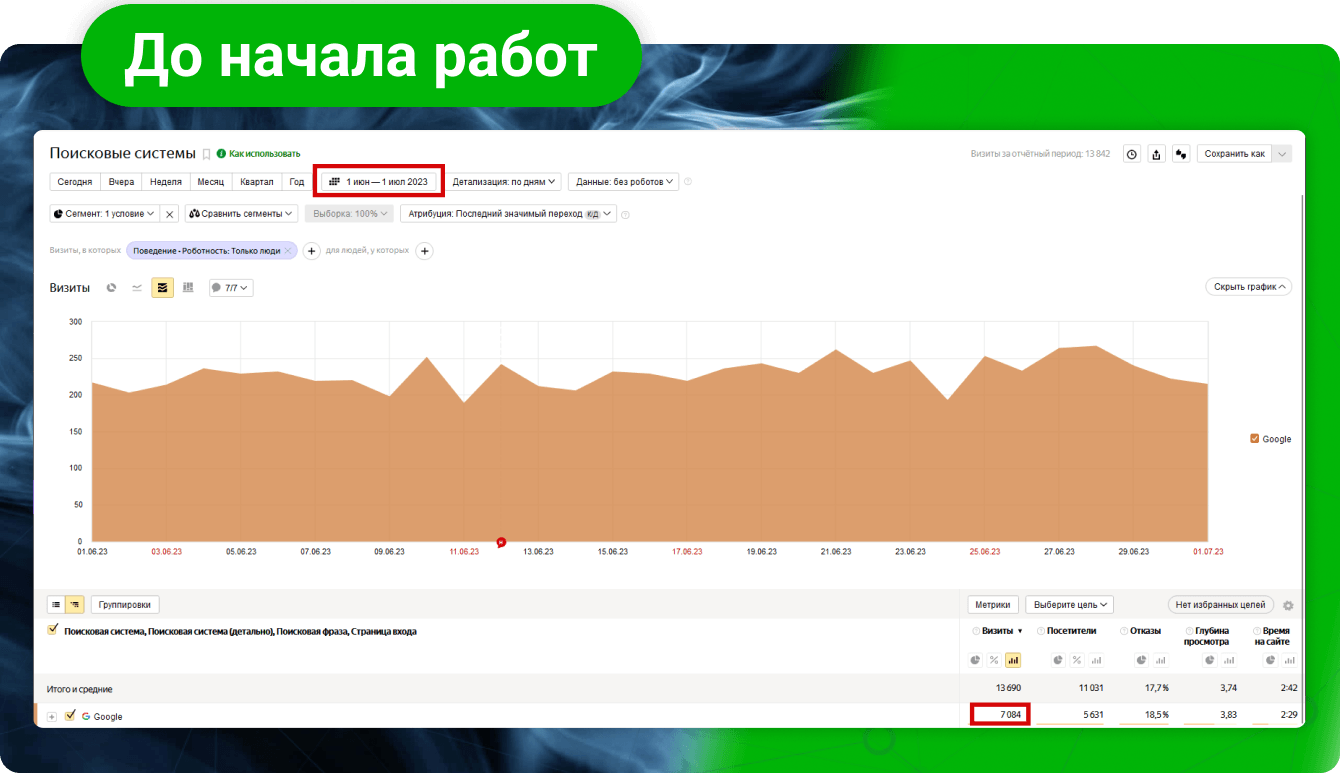 Клиент обратился к нам в июле 2023 года с проблемой низкого трафика из поисковой системы Google, малое количество переходов из органики. На момент обращения за июнь месяц на сайт клиента из ПС Google было порядка 7 тыс. визитов.