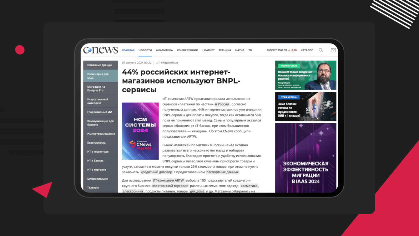 Concept Group, клиент ARTW, внедрил BNPL-сервисы во все три интернет-магазина, благодаря этому 10% заказов осуществлялось через BNPL. Однако клиент ARTW также отметил, что только 40% заказов получали одобрение, что ограничивает темпы роста использования этого инструмента.