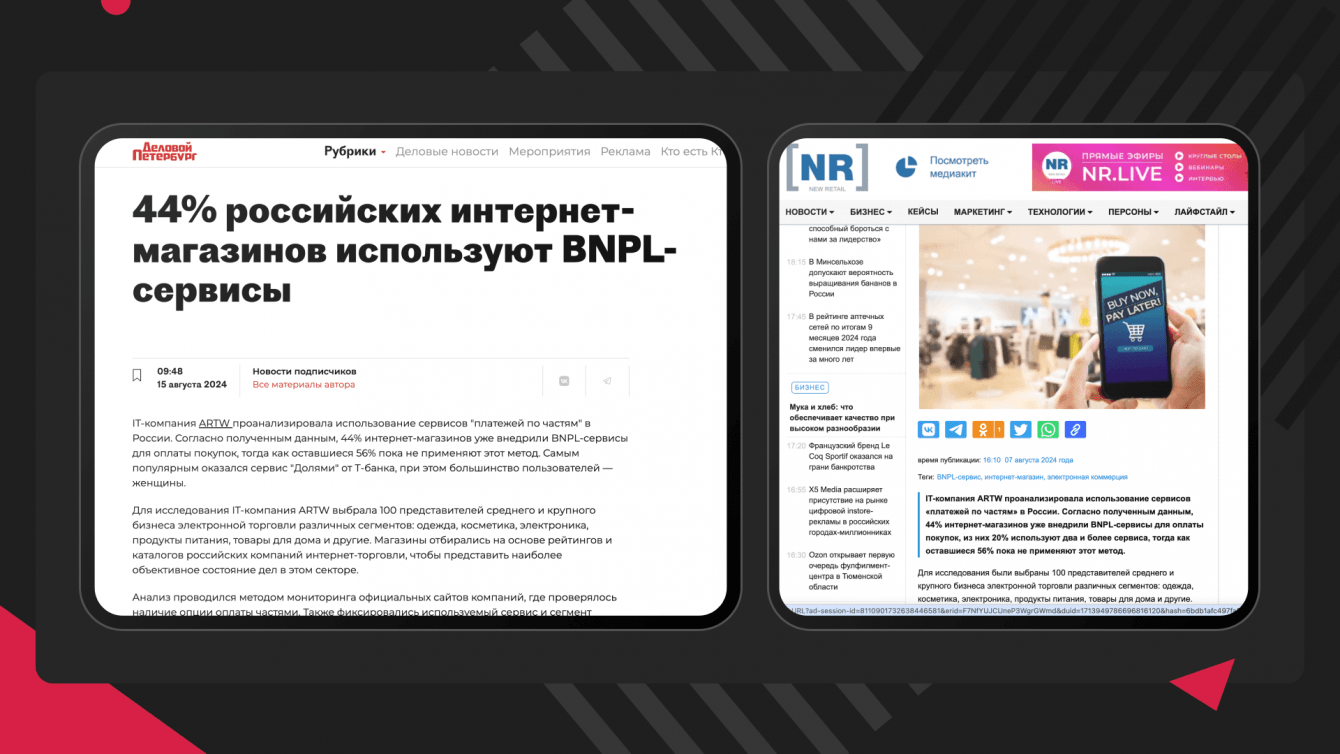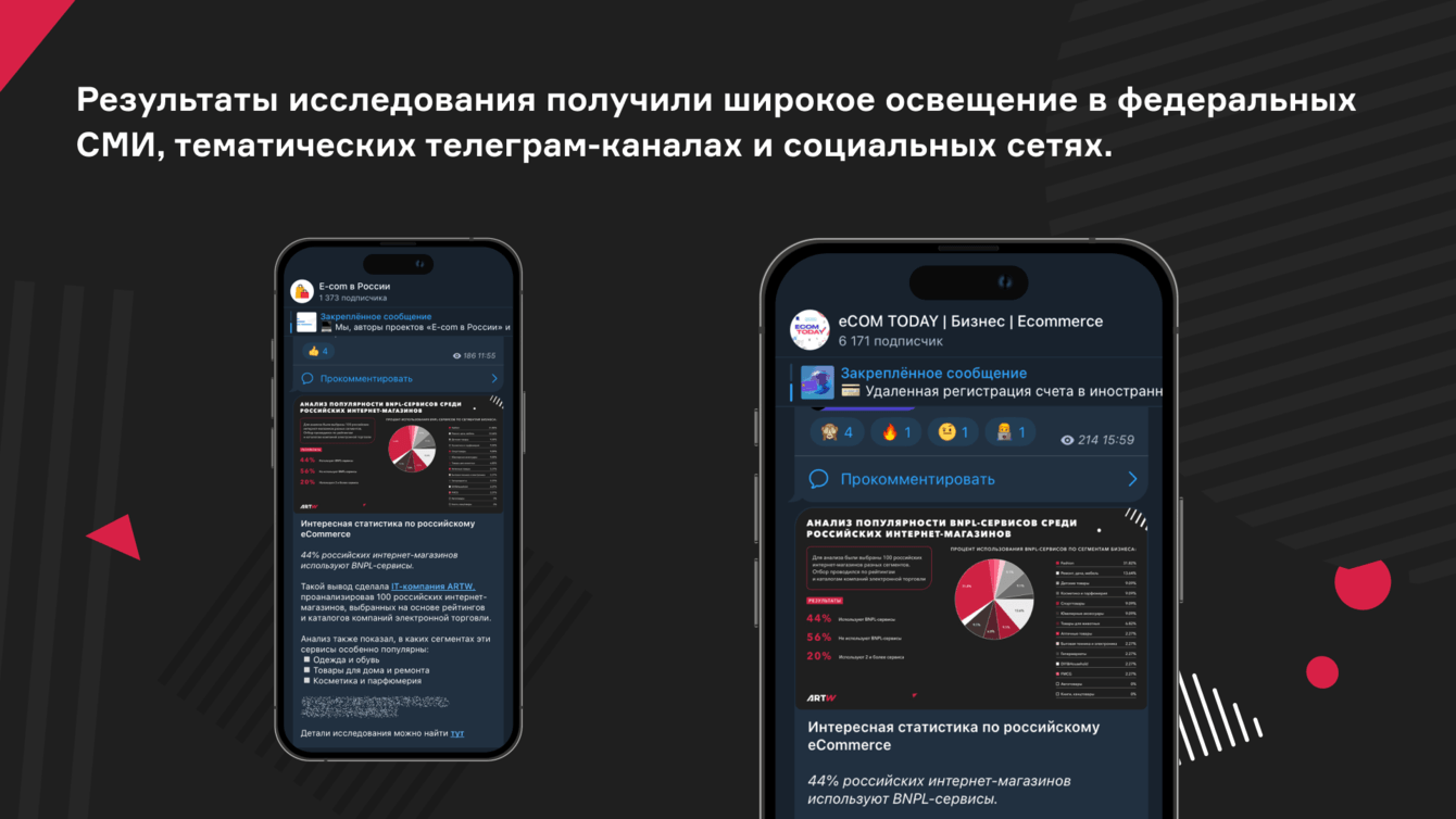 Результаты исследования были широко освещены в более чем 20 федеральных СМИ, тематических телеграм-каналах и социальных сетях, что усилило осведомленность о BNPL среди потенциальных партнеров и клиентов, стимулируя интерес и внедрение практик, способных увеличить продажи и расширить клиентскую базу.