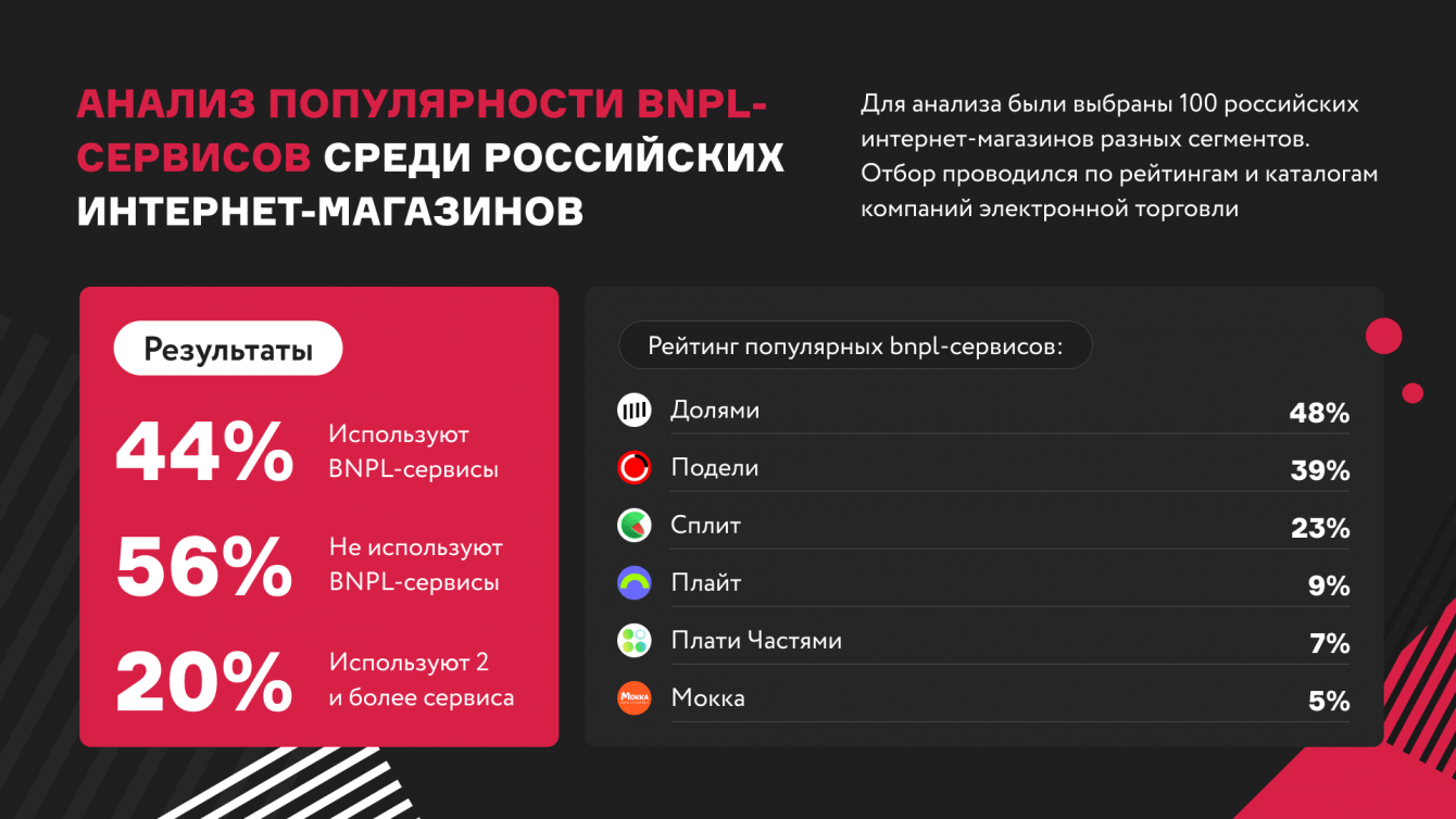 Выяснить, какой процент ритейлеров внедряет BNPL-сервисы в свои бизнес-процессы.