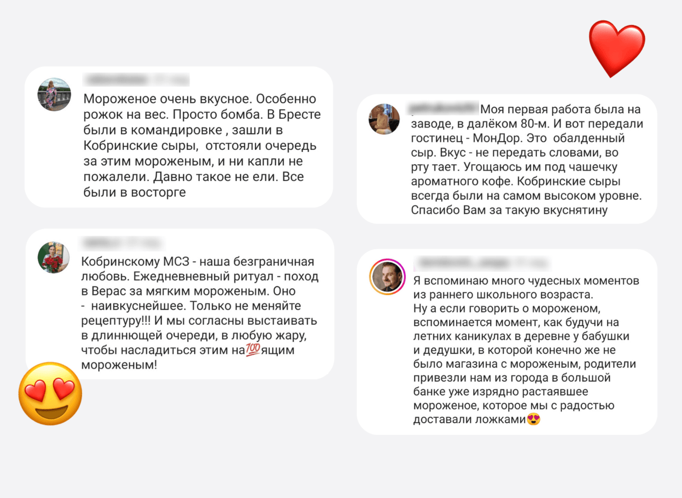 В этот проект мы влюбились сразу: продвигать продукцию, которую не раз пробовал сам, вдвойне приятно! При анализе целевой аудитории мы поняли, что многим продукция кобринского маслодельно-сыродельного завода напоминает счастливые детские годы в деревне. Пользователи любят говорить: «Сейчас все не так. А вот раньше…». Бабушкины объятия, купания в речке, сон на природе… А еще свежее теплое молочко, бабушкины сырники из свежего творога, которые не сыщешь нигде и никогда… Или где-то это все есть?
