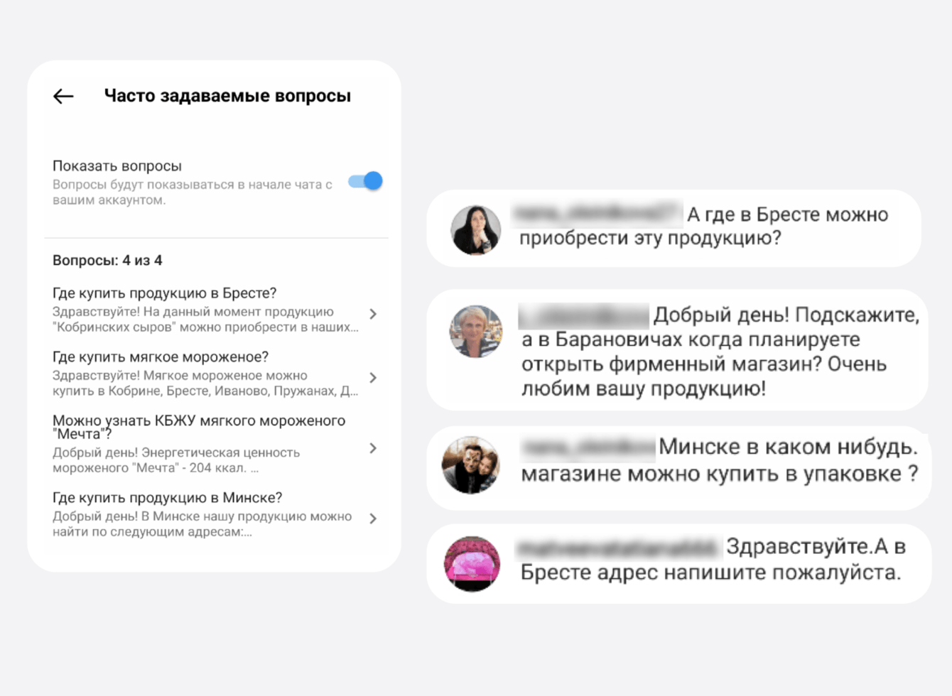 Очень большое количество сообщений было связано с уточнением адресов, где можно приобрести продукцию. Были разработаны шаблоны для быстрых ответов, а также отдельно созданы сохраненные истории и закрепленные посты для закрытия данных вопросов. Более сложные вопросы обрабатывались при поддержке клиента.