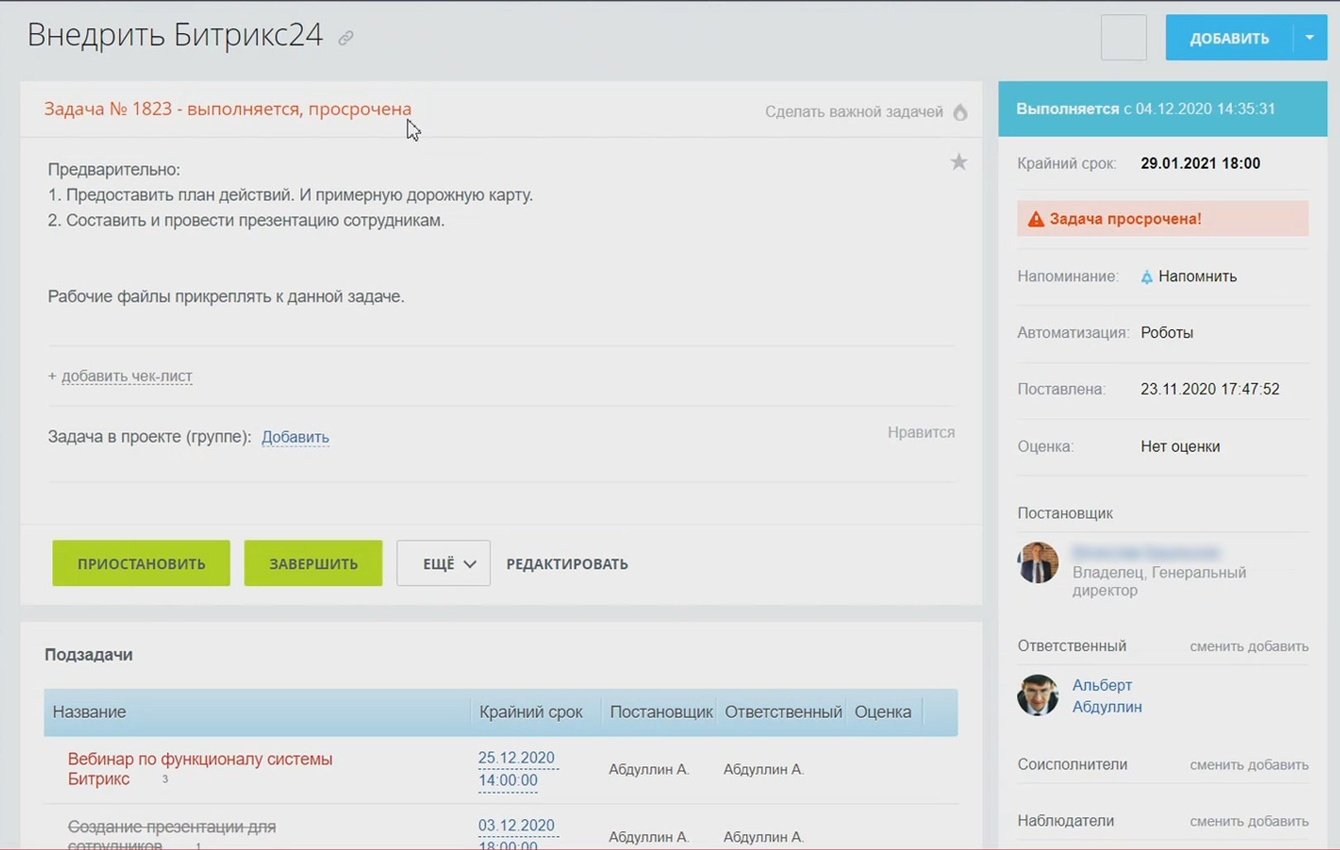 «Мы сейчас полностью оцифровываем свой функционал: каждого сотрудника, каждого отделения, поэтому активно используем модуль задач. Это намного удобнее, чем бегать, проводить постоянные оперативки. Нужно просто завести задачу и отслеживать ее выполнение, назначить ответственного, получать комментарии, документы по какой-либо задаче. Сейчас одна задача просрочена, но ведется плотная работа над тем, чтобы они не выходили из срока. Вот такая стандартная система управления в электронном формате. Я знаком с многими системами управления проектами и автоматизации, но в Битрикс24 нам было удобнее завязать работу между отделами посредством таких задач и проектов». Абдуллин Альберт, руководитель отделения распространения.