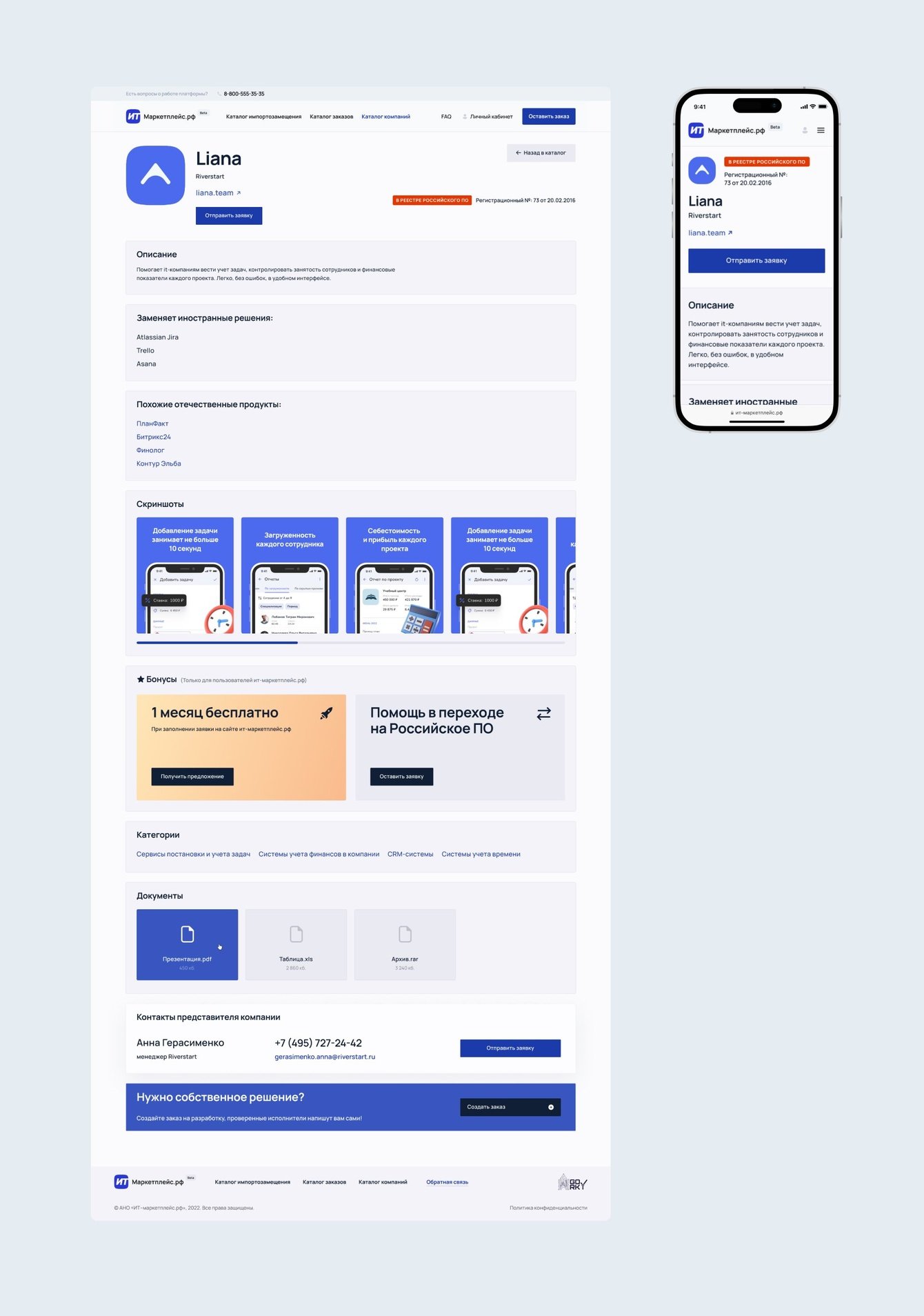 Программа из каталога открывается в отдельной карточке. Карточка сервиса презентует его: описывает функциональность и возможности, показывает список зарубежных аналогов и скриншоты, предлагает связаться с менеджером и обсудить переход на новое ПО.