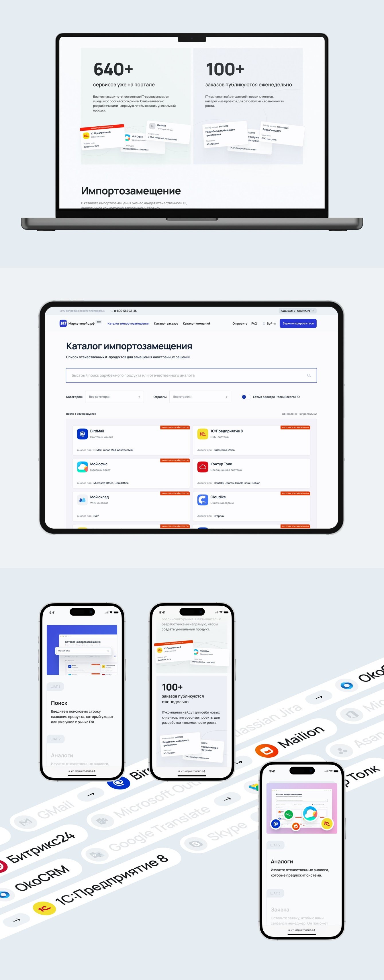 ИТ-маркетплейс.рф включает в себя каталог отечественного ПО с подробными фильтрами для легкого поиска, каталог российских ИТ-компаний с возможностью зарегистрироваться, биржу, где можно создать заявку на разработку или откликнуться на проект, а также каталог ИТ-специалистов для аутстаффинга.