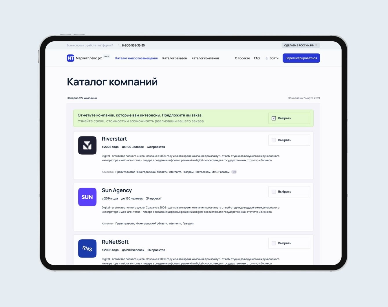 Команда Riverstart разработала и запустила ИТ-маркетплейс.рф, который не имеет аналогов на российском рынке. Платформа помогает: