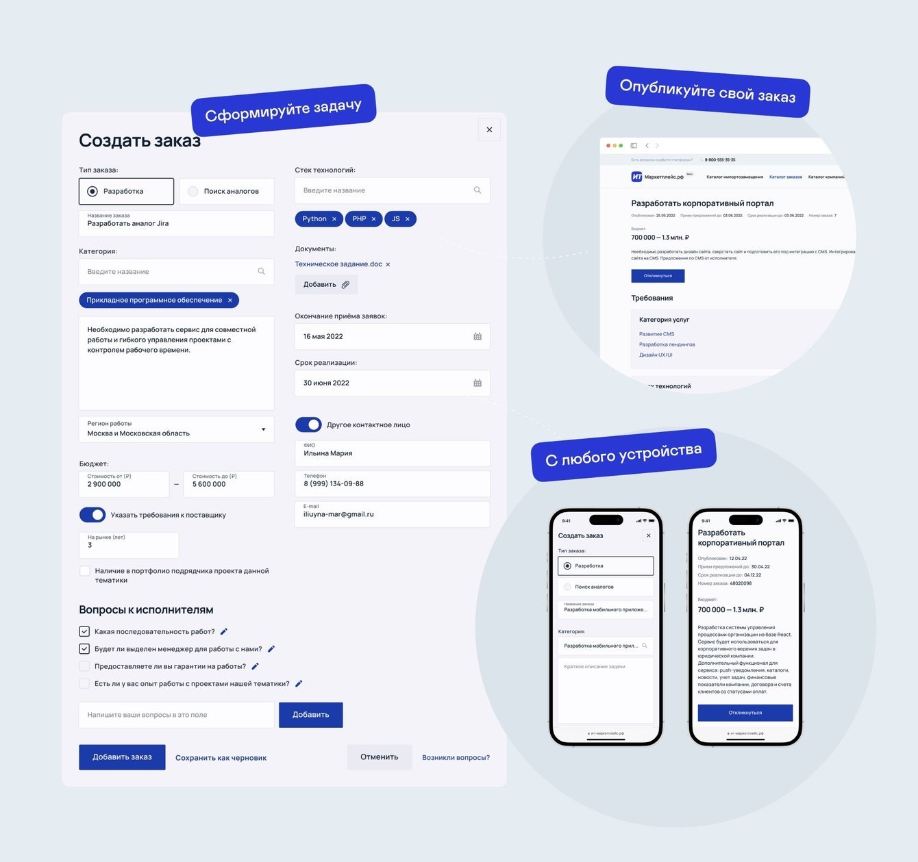 Если пользователь не смог найти аналог иностранного сервиса, он может заказать разработку решения под свои задачи. Для этого он может обратиться к конкретному подрядчику или отправить заказ всем ИТ-компаниям, зарегистрированным на платформе.