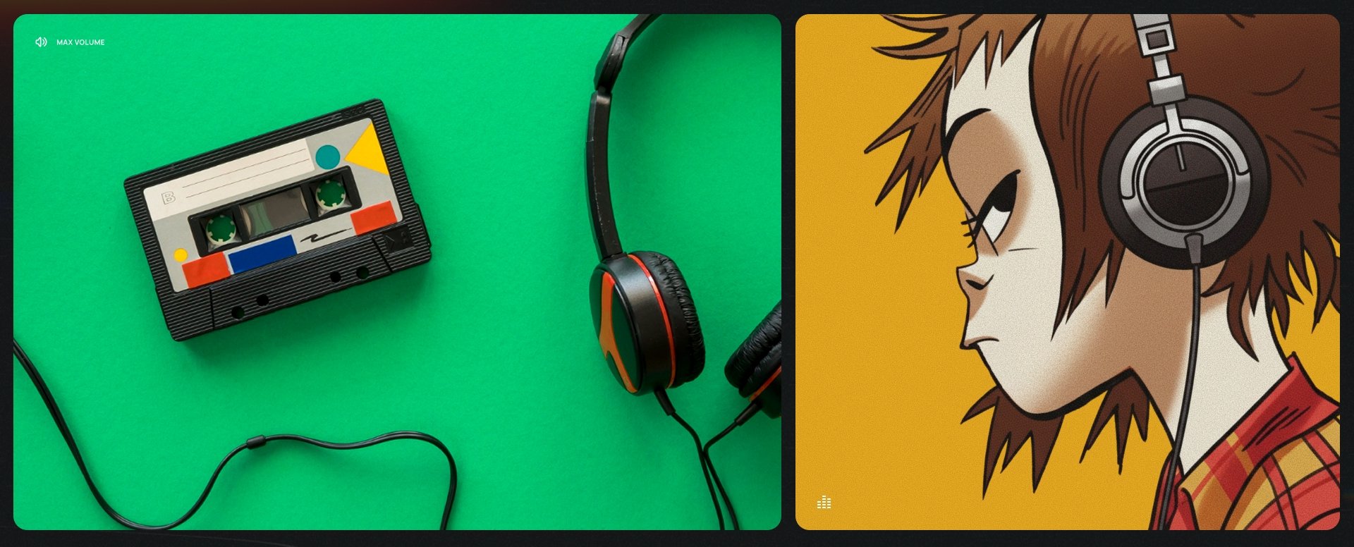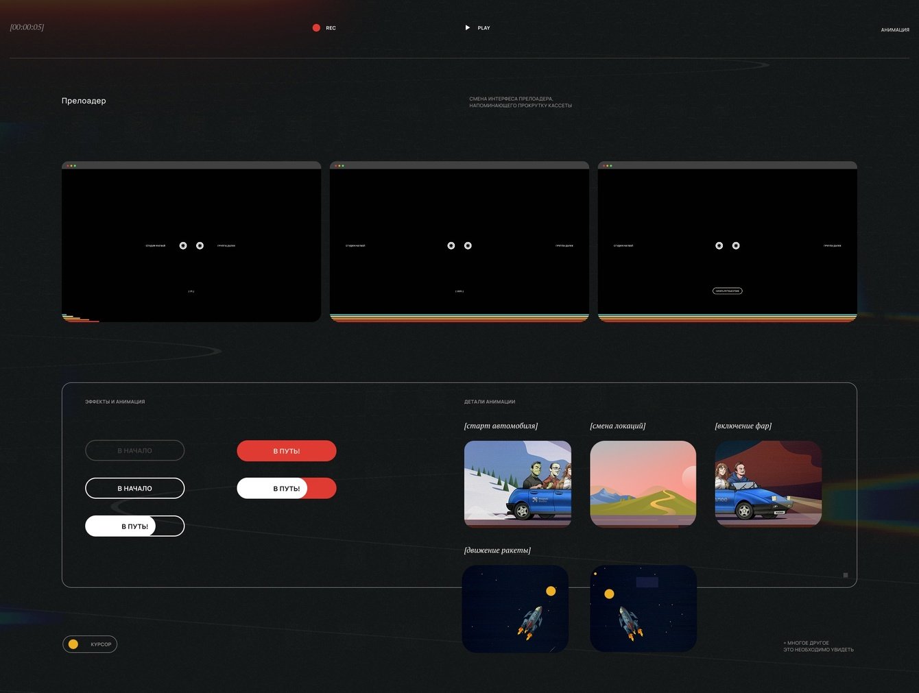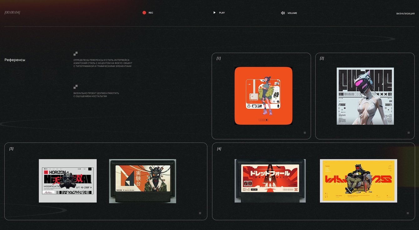 Мы переработали рамку интерфейса, усилили ощущение экранности и поменяли стартовую механику. Вместо обычного прелоадера появился экран с кассетой, которую пользователь как будто вставляет в проигрыватель. Щелчок, запуск — и начинается путь. Очень простой прием, но именно он идеально собрал историю воедино.