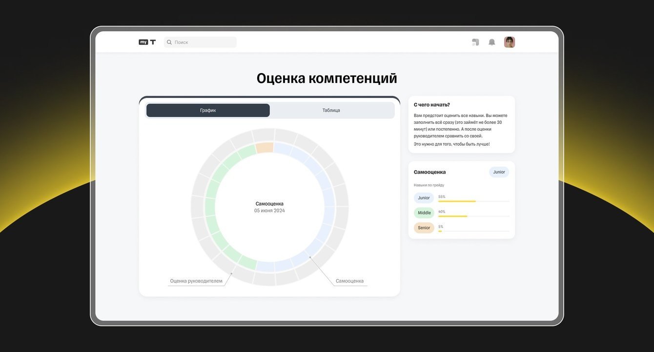 Шаг 1. Пользователя встречает первый экран с графиком навыков, который предстоит заполнить. Здесь есть подсказка, где будет отображаться оценка сотрудника и руководителя, и яркая заметная кнопка с переходом ко всему списку навыков.