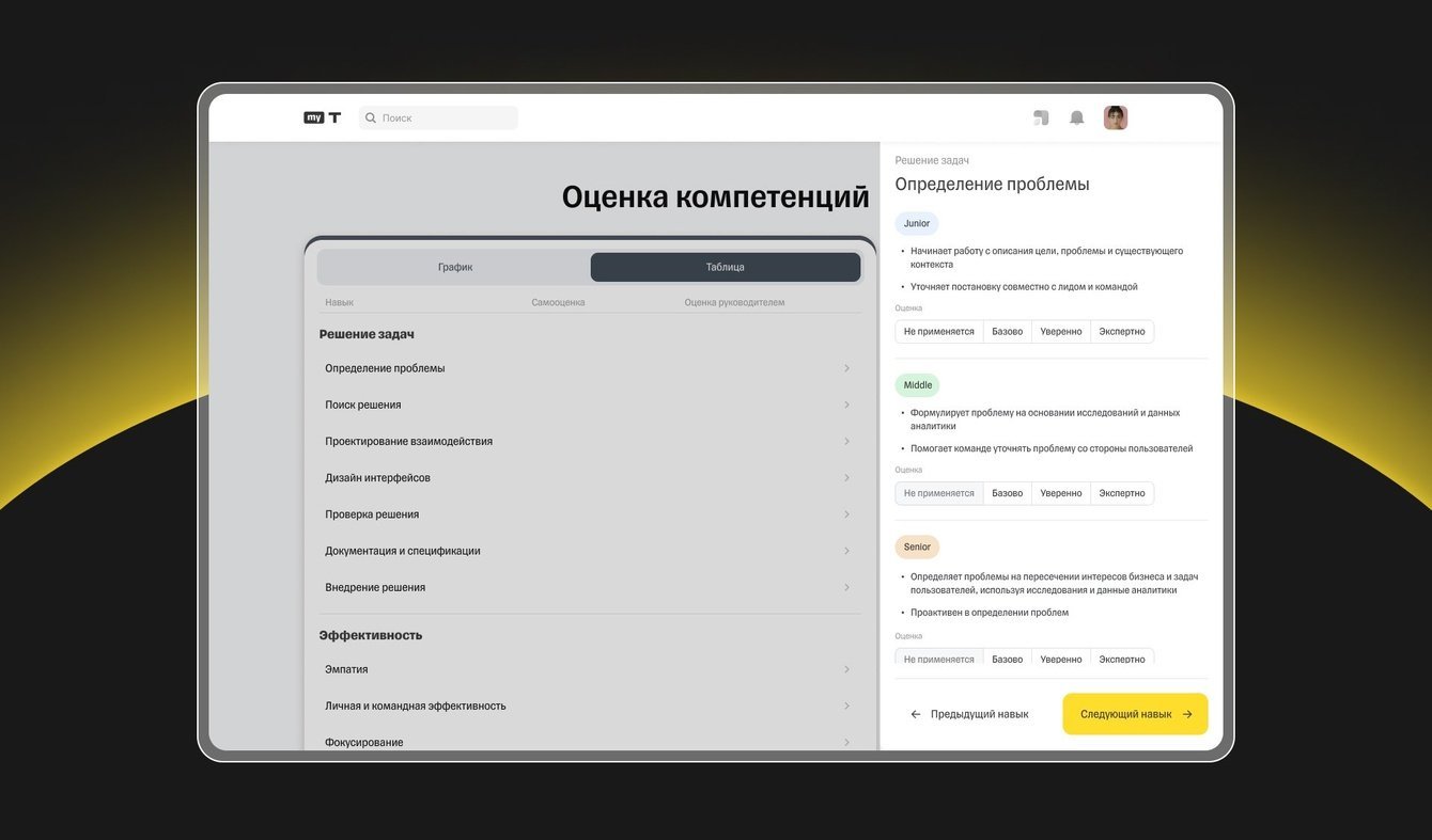 Наталья проходит обучение в Британской высшей школе дизайна. Его частью стала работа над реальными кейсами для крупных компаний: Тинькофф, МТС, ВК, Сбер, Google. Одной из семи команд, в которой была Наталья, поставили задачу - сделать интерфейс матрицы компетенций для Тинькофф.