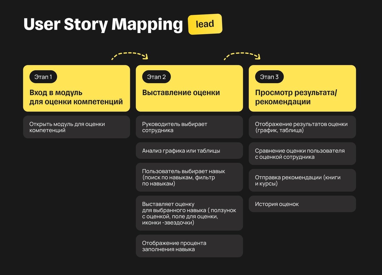 3. Делаем визуализацию пользовательских историй (User Story Mapping), чтобы заложить фундамент в проектировании UX. Определяем шаги, которые будут проходить пользователи, и основные приоритеты для ранней версии продукта (mvp).