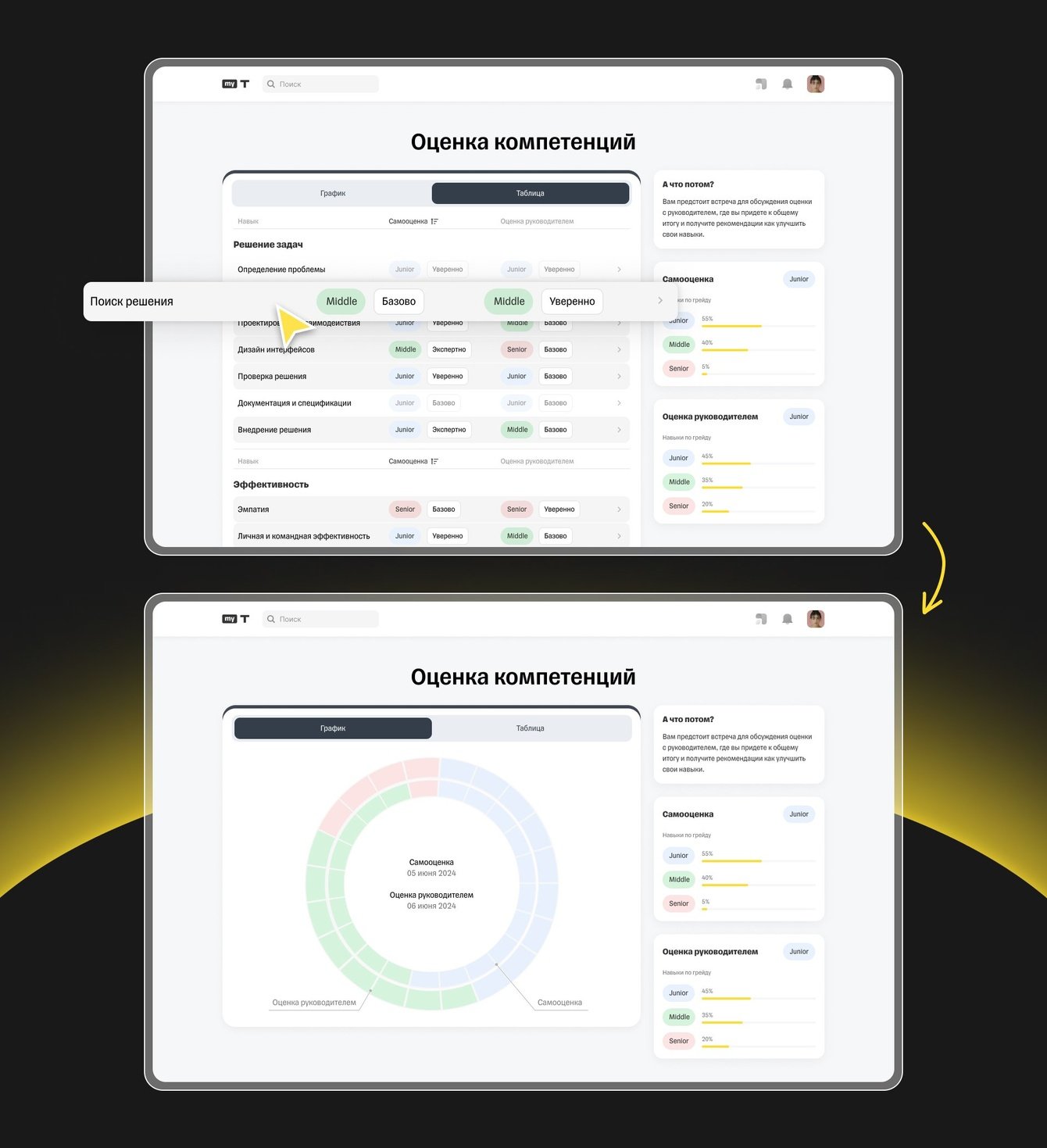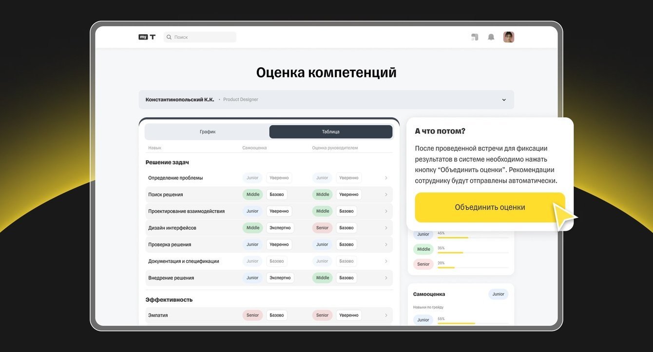 Шаг 4. После обсуждения оценок с сотрудником руководитель может скорректировать свои оценки. Далее он нажимает кнопку “Объединить оценки” в боковой панели. Итоговые оценки по умолчанию будут теми, что поставил руководитель. После этого в боковой панели сотрудник может увидеть навыки, которые ему нужно прокачать, со ссылкой на базу знаний.