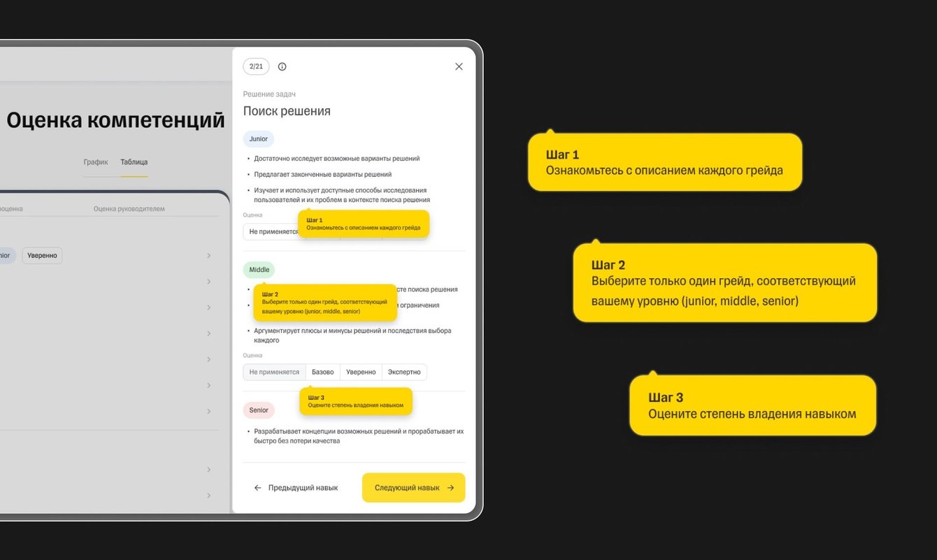 Шаг 2. Пользователь видит таблицу с 3 компетенциями, в каждой из них по 7 навыков. При выборе одного из них открывается боковое модальное окно с описанием ожидания по каждому грейду. В рамках одного из грейдов проставляется общая оценка по навыку: не применяется, базовый, уверенный и экспертный уровень владения.