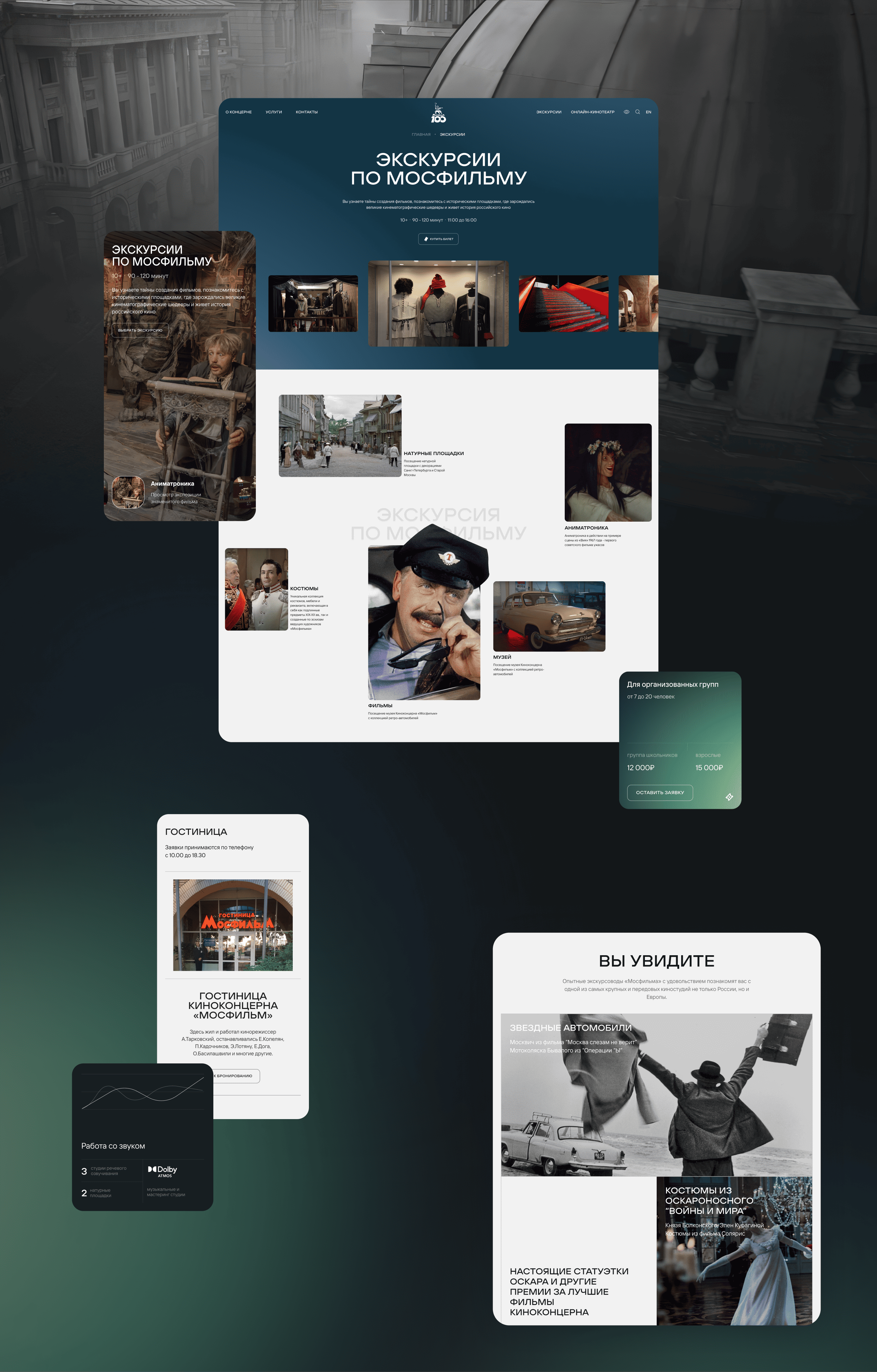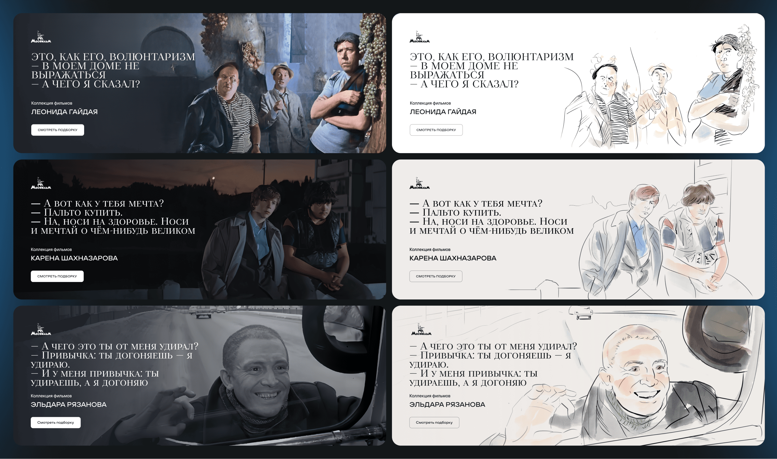Мосфильм — это не просто фильмы, это наше детство и семейные традиции. Нам важно было показать эту уникальность. Здесь нашлось место всему: закулисью, творчеству и современным решениям. Полный цикл кинопроизводства. Мы вдохновились магией кино, чтобы создать digital-айдентику, которая рассказывает о Мосфильме без слов. Софиты, хлопушка, режиссеры, культовая заставка, постеры, нарисованные вручную, и яркие иллюстрации знаковых сцен из любимых фильмов — всё это стало частью нового сайта. Мы глубоко переработали структуру сайта для удобства аудитории: обновили меню, продумали навигацию, добавили новые блоки на страницах и улучшили мобильную версию. Изучив запросы пользователей, мы добавили недостающую информацию. Теперь сайт доступен для всех: он включает англоязычную версию и режим для слабовидящих. Этот проект — не просто сайт, а отражение Мосфильма как национального достояния. Он сохраняет главное: атмосферу, искусство и душу отечественного кино.