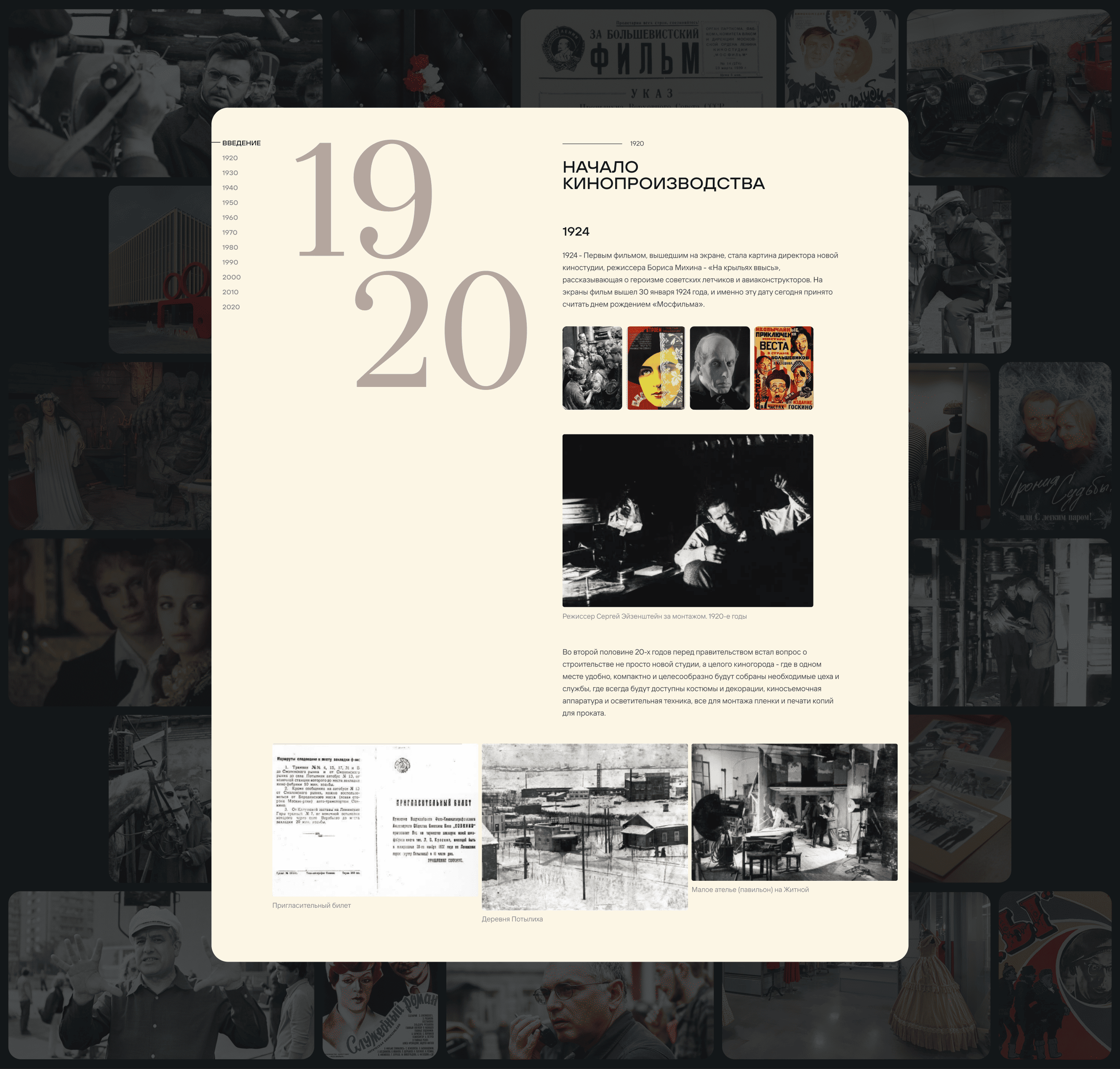 Сайт погружает нас в мир, созданный «Мосфильмом», — от первых черно-белых кадров до современных лент.