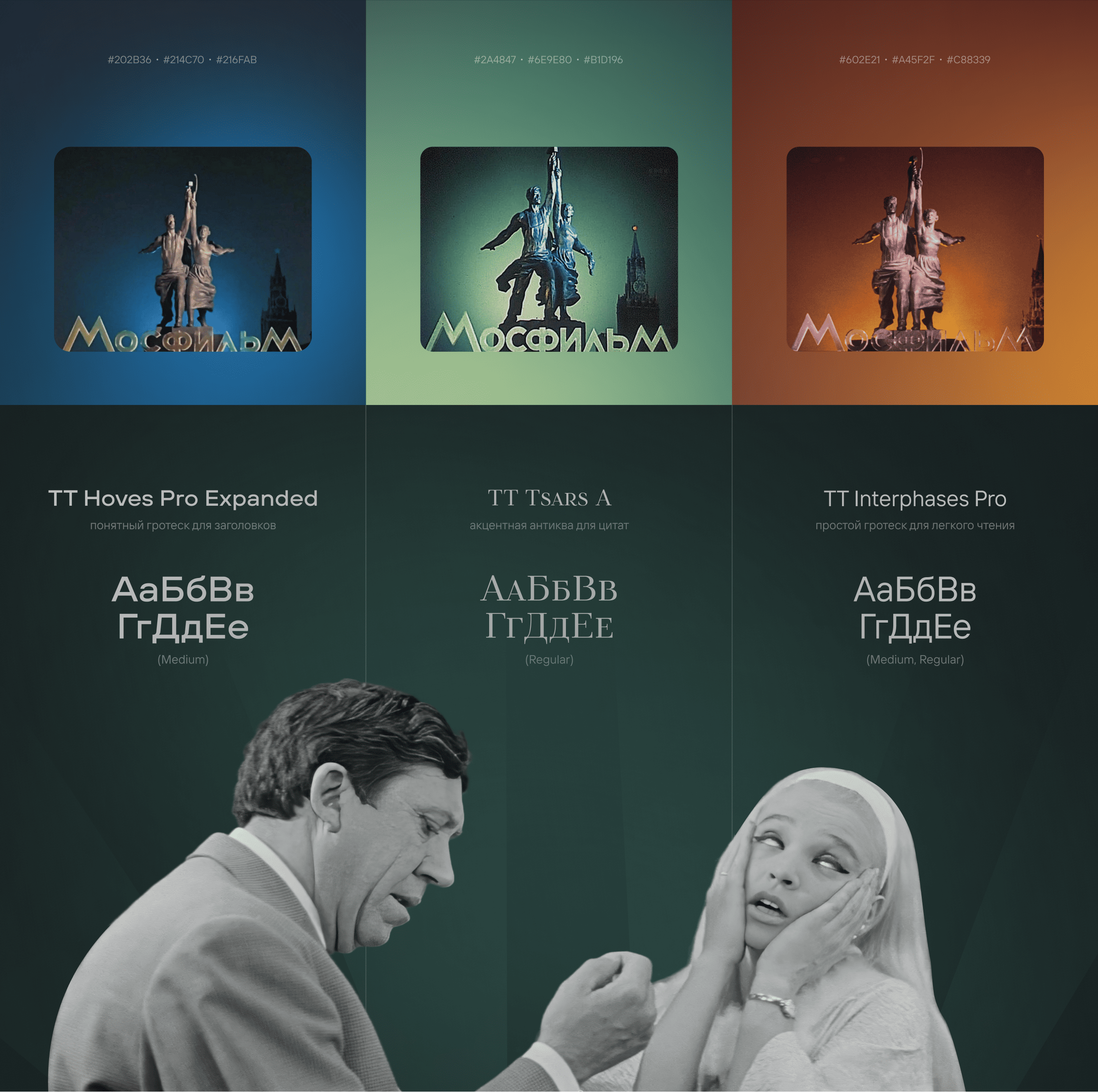Мы стремились передать дух «Мосфильма» — студии, на которой создавалась история отечественного кино. Единственным строго заданным элементом брендбука был логотип, все остальное предстояло придумать. Мы погрузились в архивы: изучили старые афиши, культовые кадры, фотографии павильонов, чтобы прочувствовать то самое наследие, которое мы все знаем, любим и ценим.