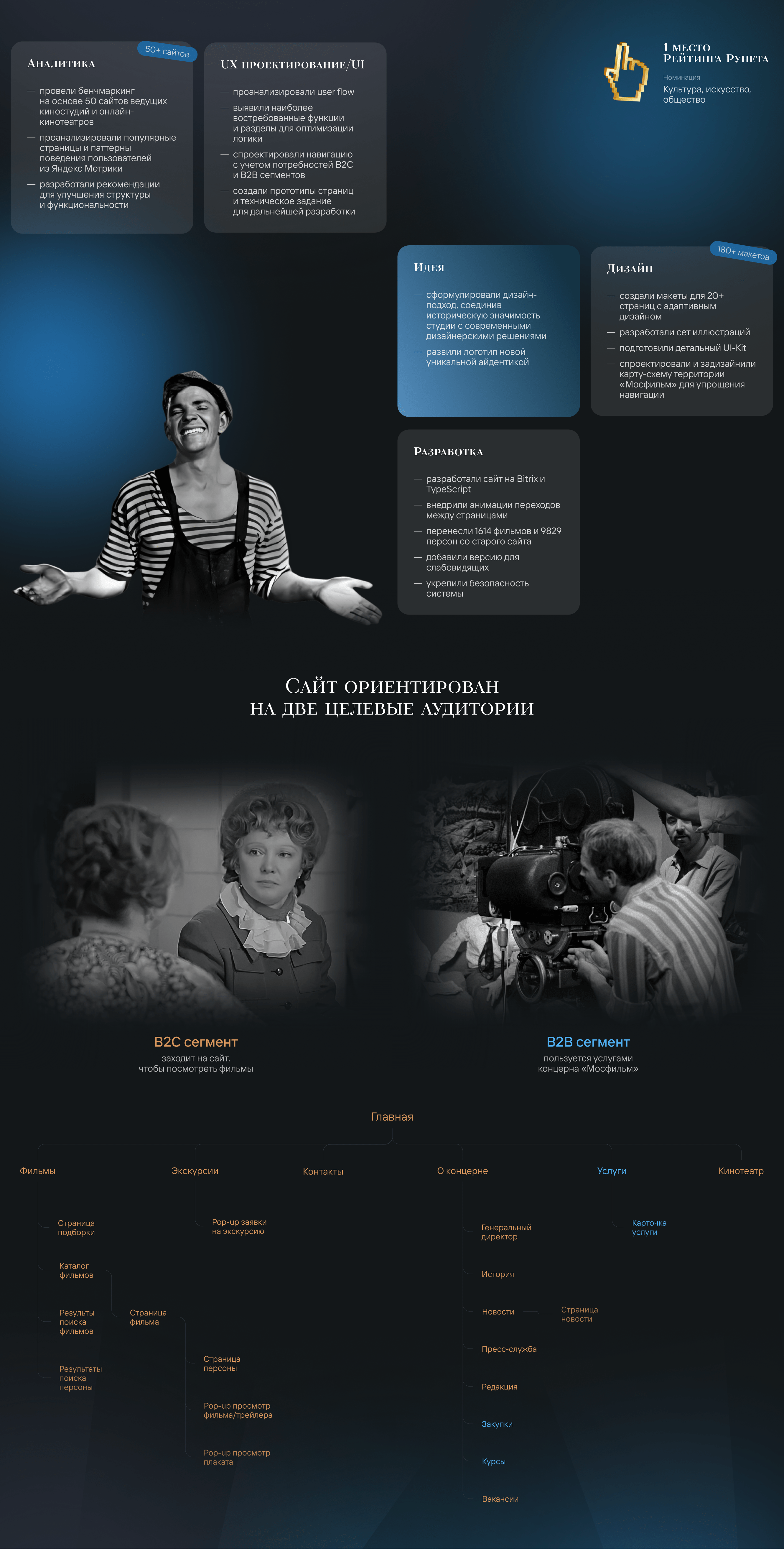 К 100-летию киностудии был разработан сайт с индивидуальным дизайном и продуманной структурой, ориентированной на две основные аудитории: любителей кино и клиентов. Новые функции привлекли больше пользователей, значительно повысив интерес к контенту киностудии.