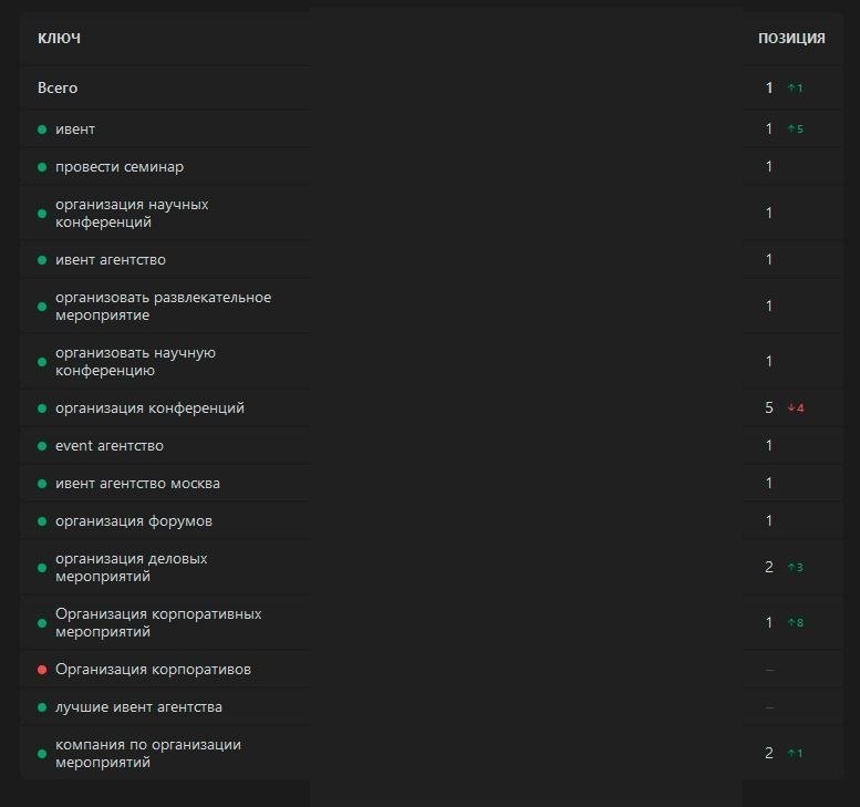 Сайт вышел в топ-10 Яндекса по запросам «ивент-агентство Москва», «организация корпоратива», «тимбилдинг Москва» и десяткам смежных запросов
