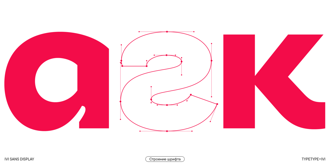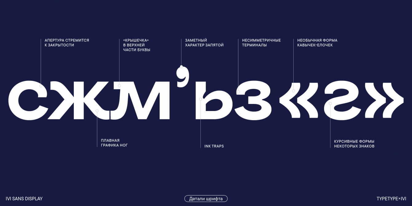 Совместно с командой Иви мы решили создать фирменный шрифт Ivi Sans Display с нуля, не опираясь на существующий. Ориентиром для работы стали шесть прилагательных, определяющих ценности бренда: эмоциональный, современный, мягкий, оригинальный, яркий и добрый. При этом специалисты Иви хотели, чтобы шрифт был асимметричным, «с чудинкой». Для вдохновения дизайнеры TypeType обращались к визуальной айдентике Иви, в частности — логотипу. Так как большая часть коммуникаций происходит на русском языке, все дизайнерские решения опирались на специфику кириллических знаков.