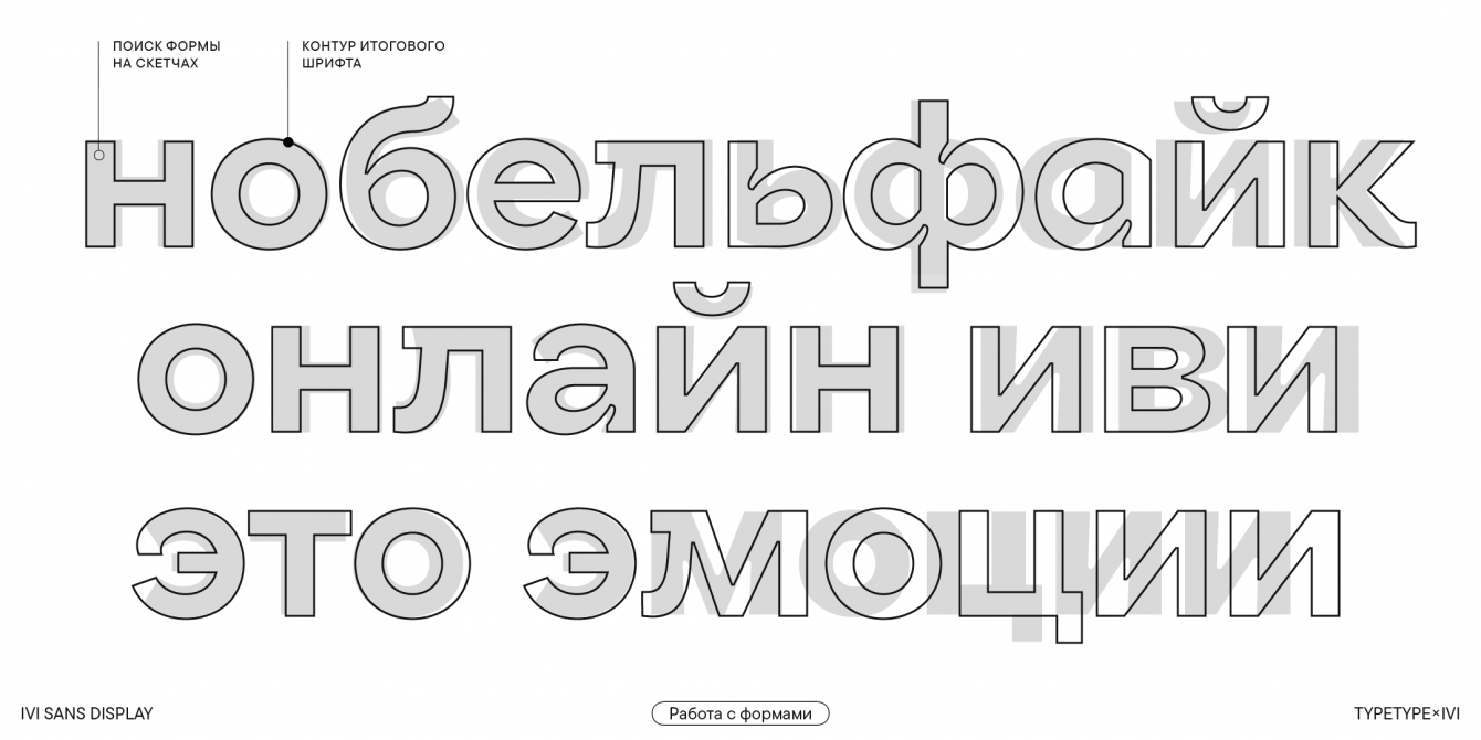 Исходя из этих данных, шрифтовые дизайнеры создали несколько вариантов скетчей, чтобы команда онлайн-кинотеатра могла выбрать из нескольких вариантов наиболее подходящий. Выбранный набросок лег в основу будущего шрифта — так началась работа над Ivi Sans Display.