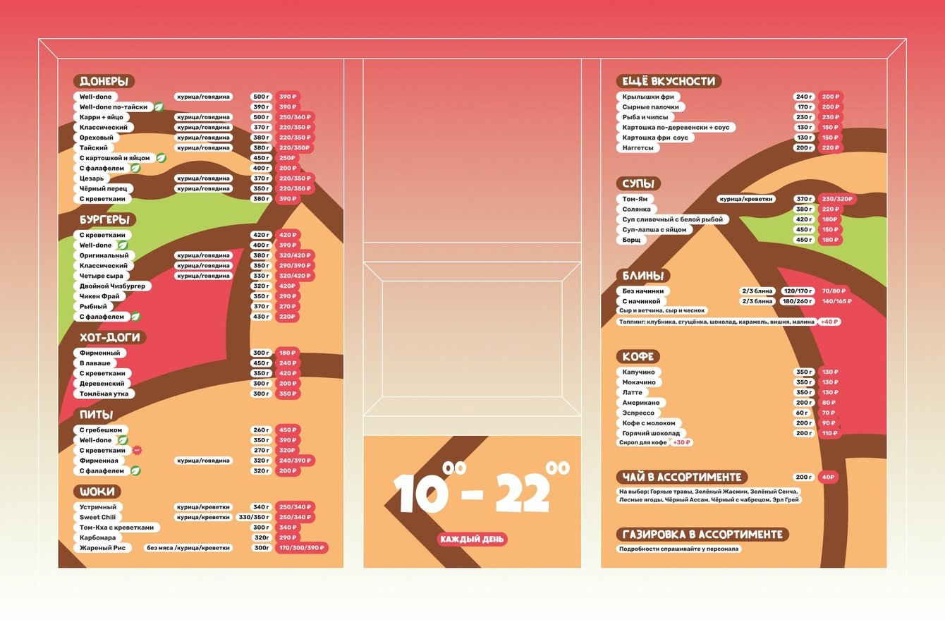Начали с витрины, которую клиент попросил оформить в первую очередь: «меню должно быть наглядным, красивым, удобным и с часами работы».