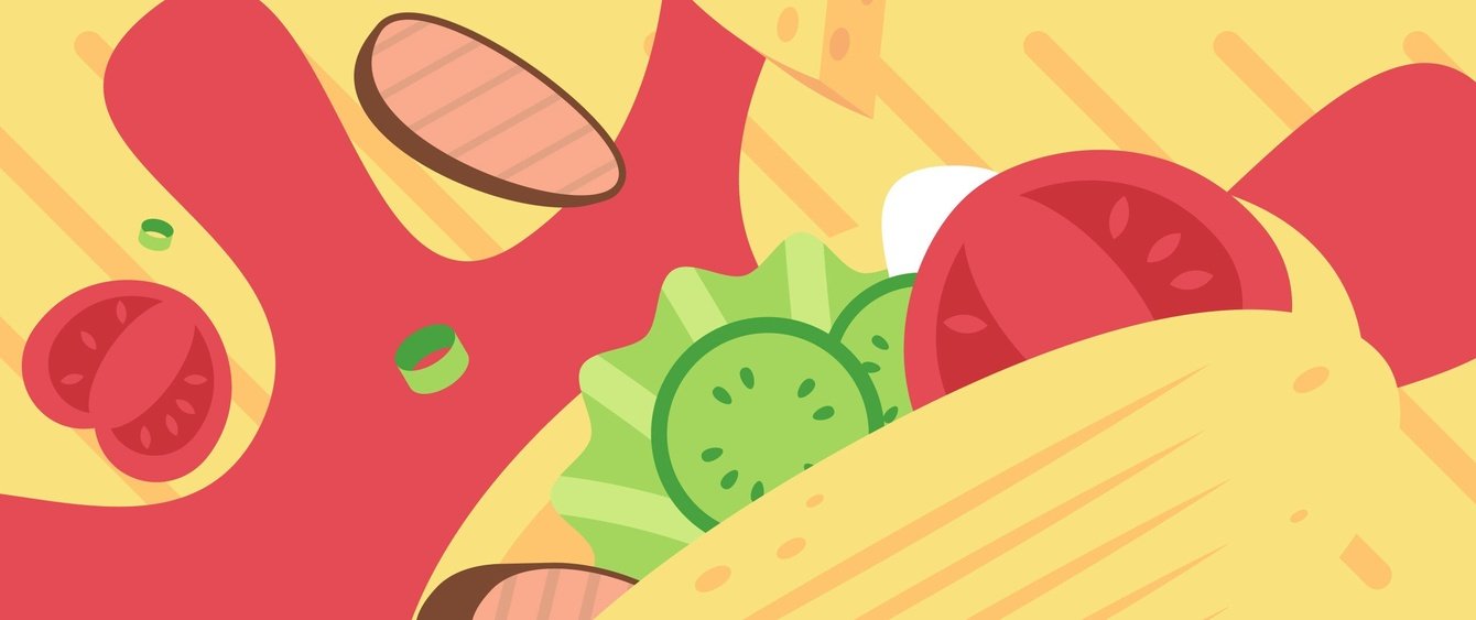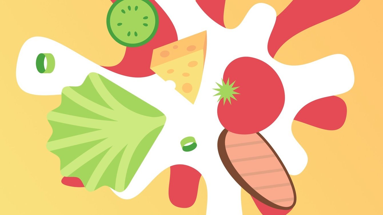 Ингредиенты показывают, какое разнообразное и вкусное меню у заведения — соус, кофе, булочки, помидорки, огурчики, следы гриля и другое.